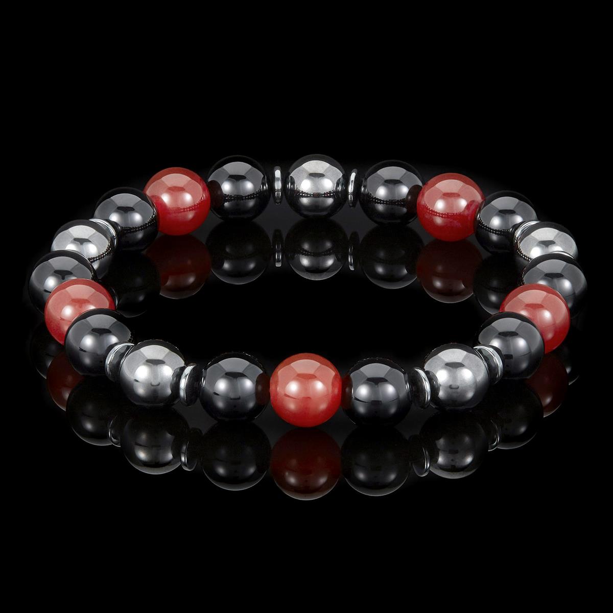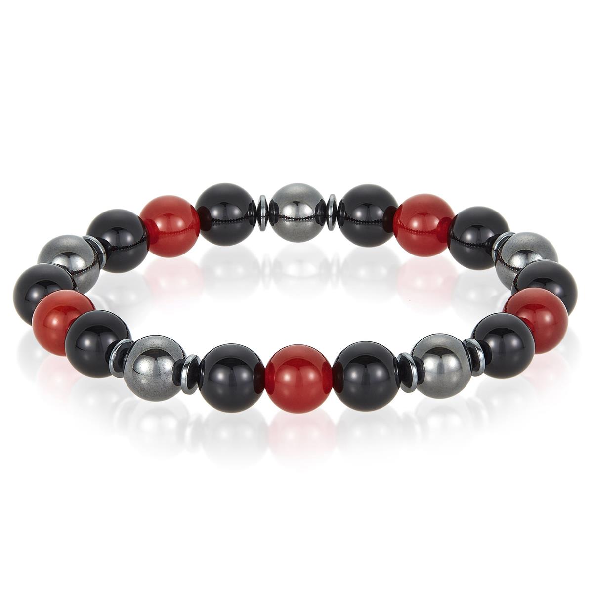 Wear this stylish stretch bracelet with any style. The bracelet has 5 Red Agate stones, paired with 10 Onyx stones and 5 magnetic Hematite stones, for a total of 20 stones.