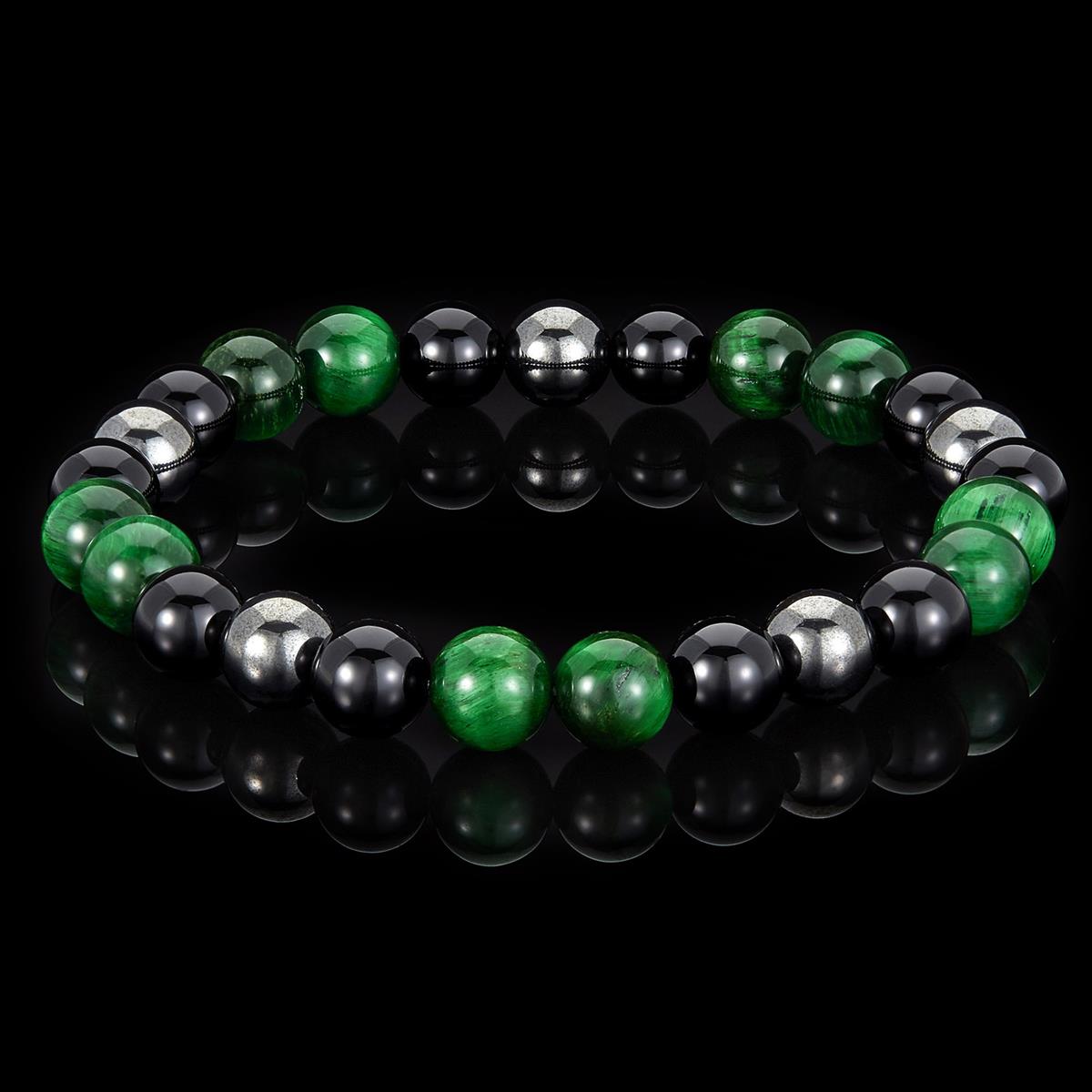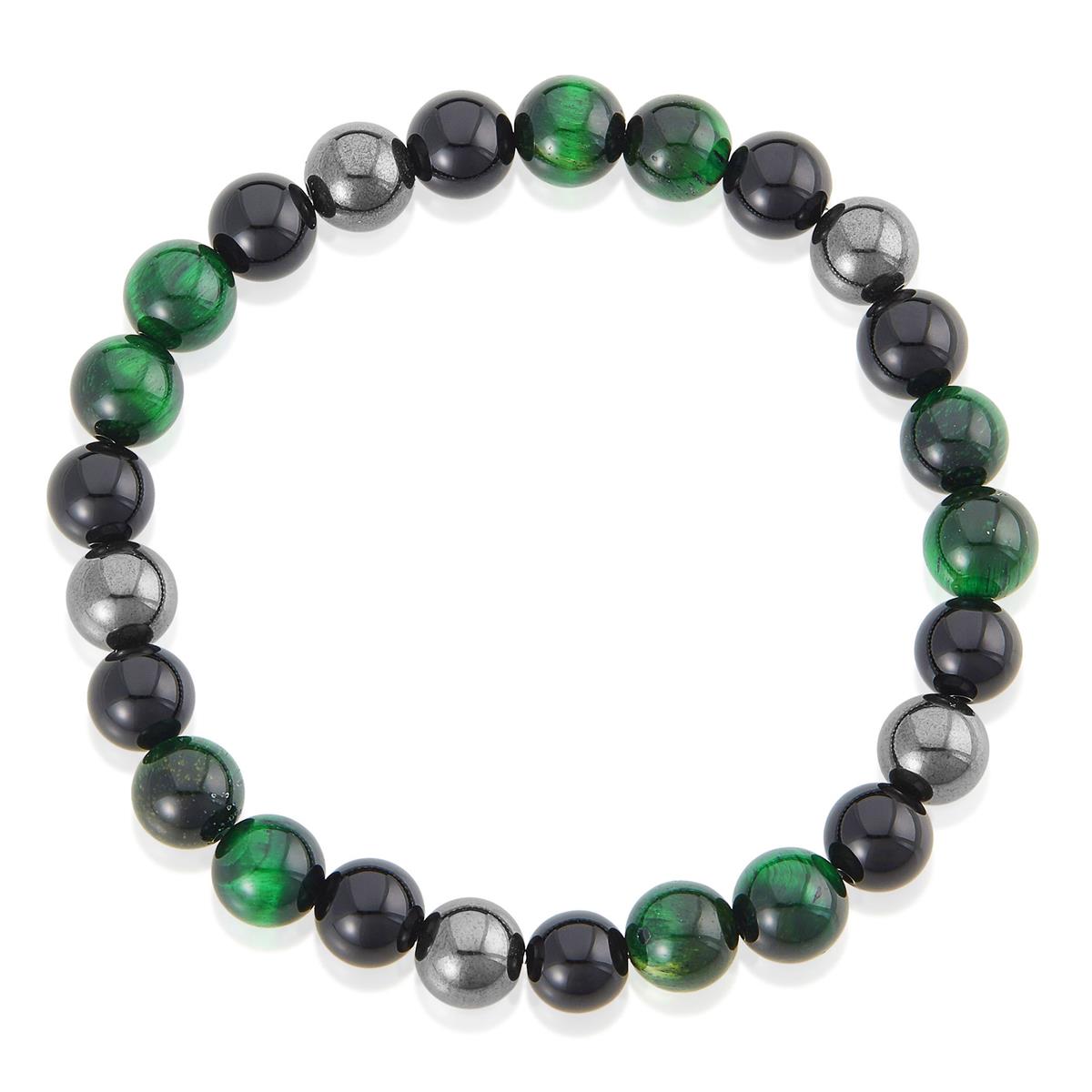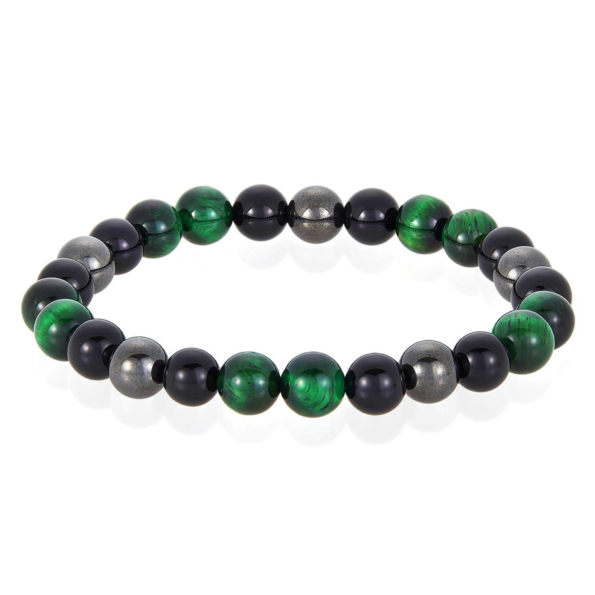 8mm Bead Stretch Bracelet Featuring Green Tiger Eye, Shiny Black Onyx and Magnetic Hematite