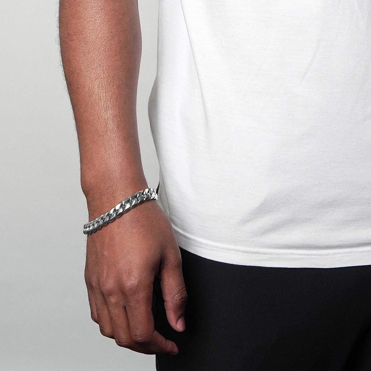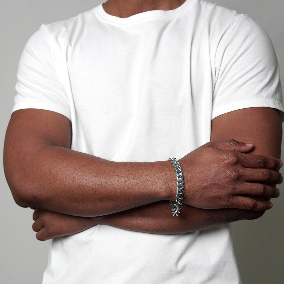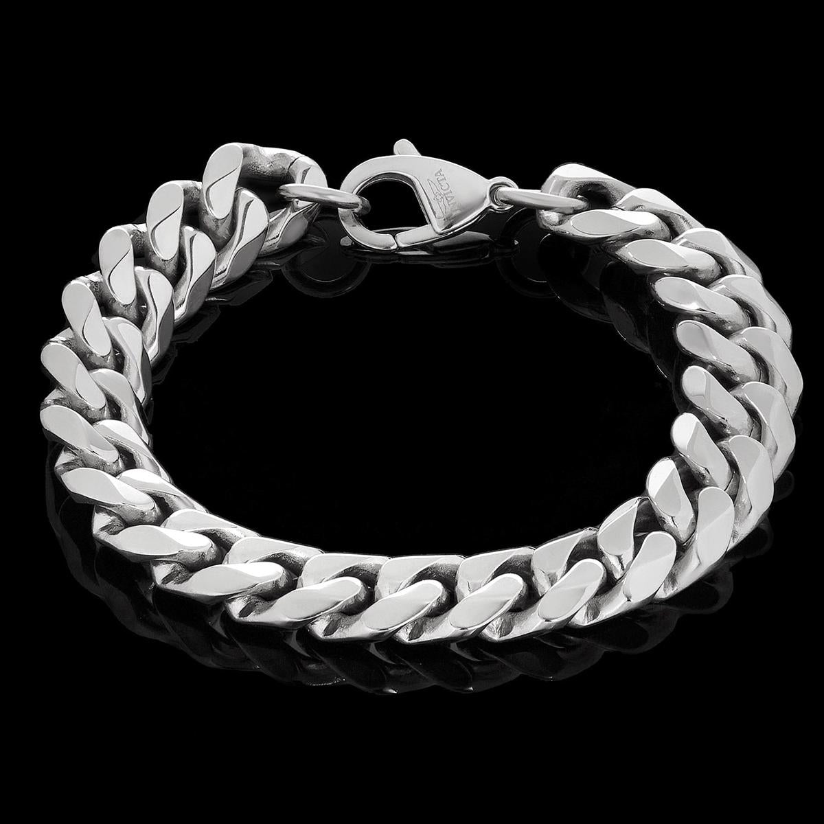 Want to accentuate your watch with a cool accessory? Then slide on this Invicta Jewelry bracelet! The wide stainless steel curb links will give you a sleek, industrial look. Complete with an Invicta emblazoned lobster clasp, this bracelet goes perfectly with your favorite accessories! The 9 inch bracelet has a width of 9/16 inches.