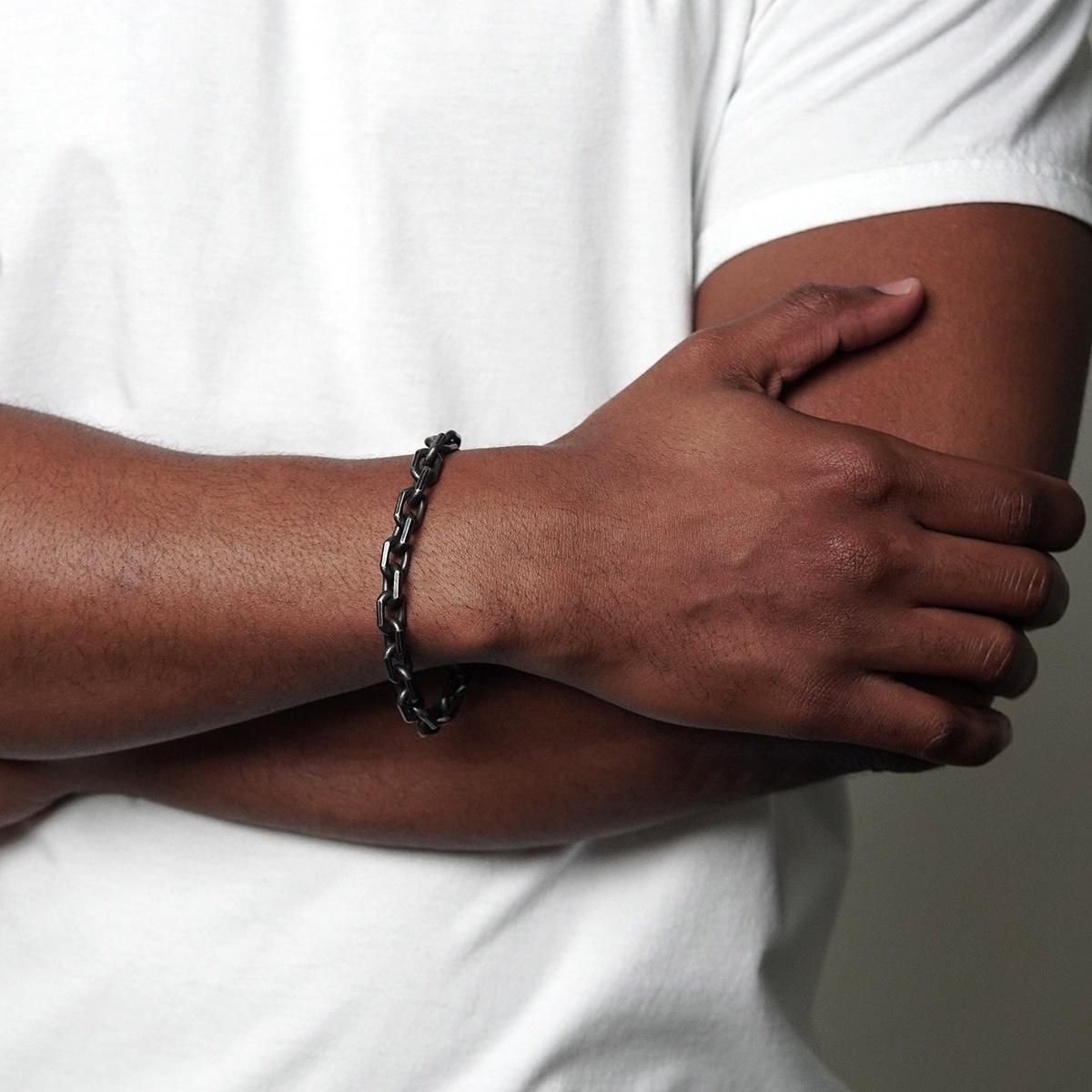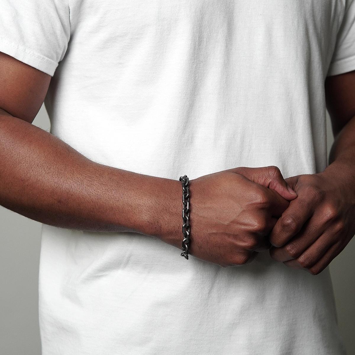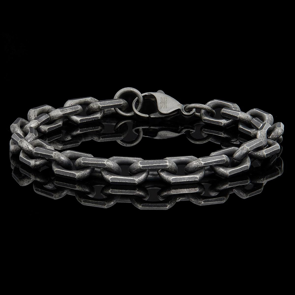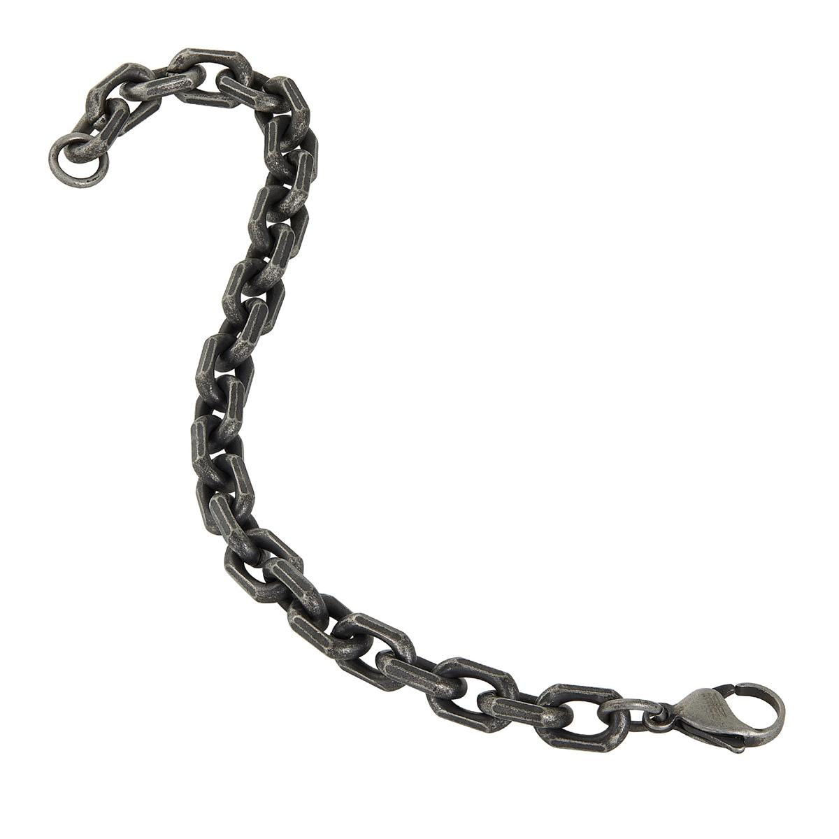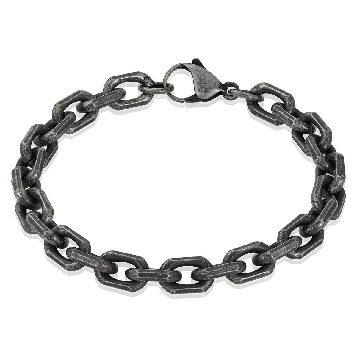 Complete your stylish look when wearing this unique link chain bracelet. The bracelet is crafted with durable stainless steel and features rectangular shaped links. The bracelet has a wearable length of 8.75 inches, a width of 8.5 millimeters and fastens with a lobster claw clasp. The matte finish with the beveled edges creates an eye catching design that'll pair perfectly with favorite accessories. Grab the matching chain necklace and complete the look!