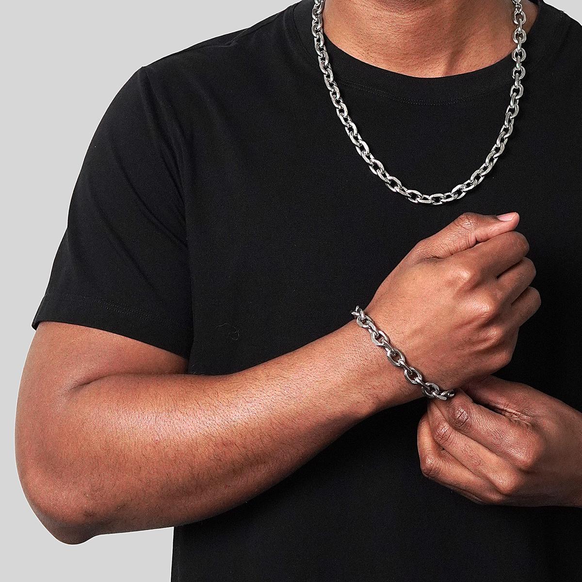 Complete your stylish look when wearing this unique link chain bracelet. The bracelet is crafted with durable stainless steel and features oval shaped links. The bracelet has a wearable length of 8.75 inches, a width of 10.6 millimeters and fastens with a lobster claw clasp. The polished finish with the knife edges creates an eye catching design that'll pair perfectly with favorite accessories. Complete the look by grabbing the matching chain necklace!