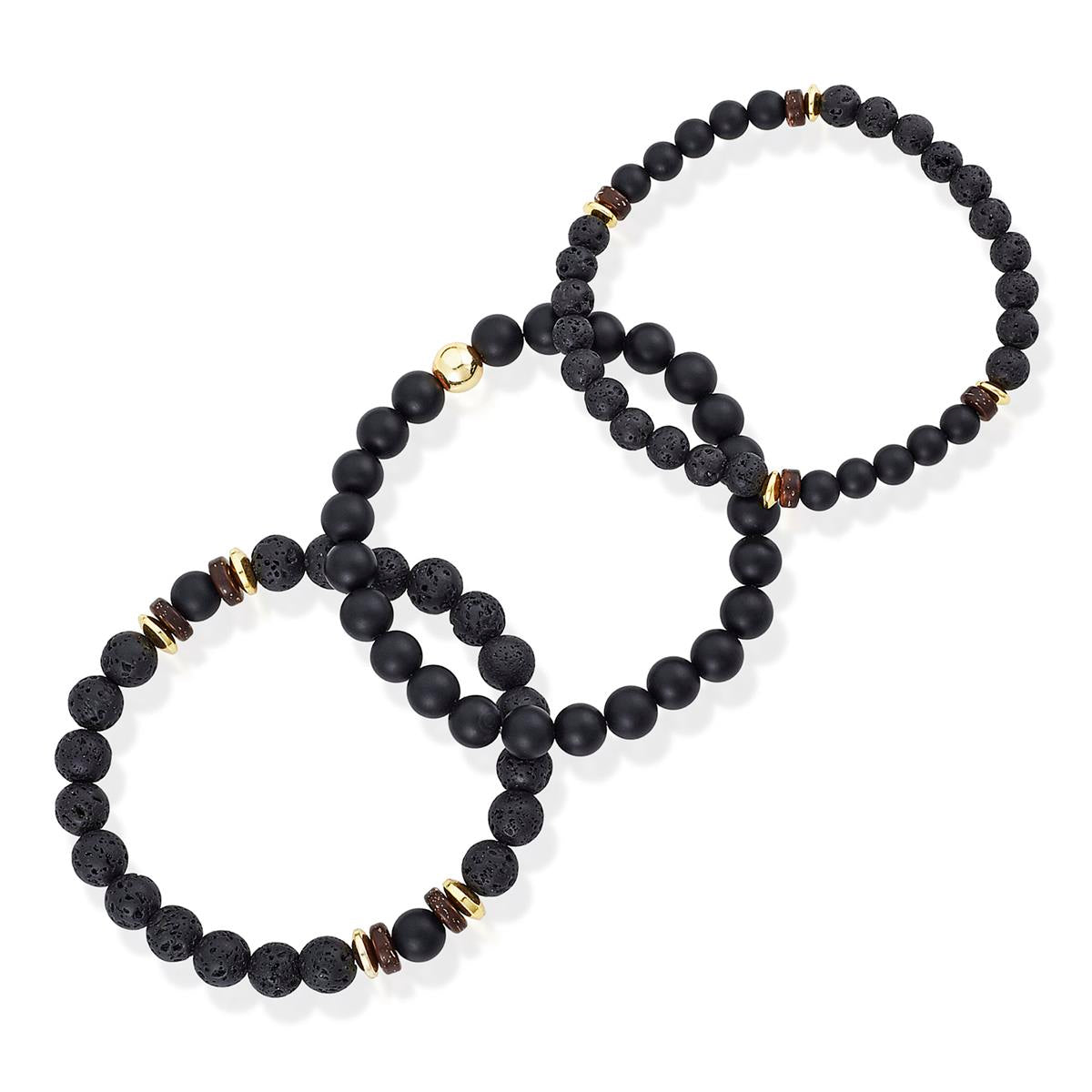Set of 3 Bracelets - Matte Black Agate, Lava, Wood and Gold Hematite Bead Stretch Bracelets