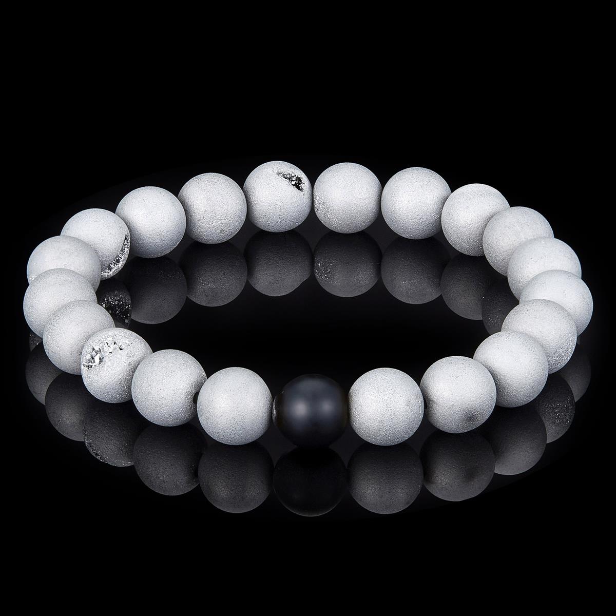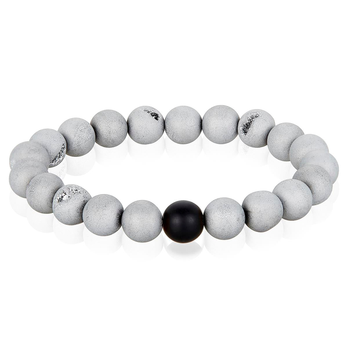 Invicta Silver Druzy Agate and Black Matte Onyx 10mm Natural Stone Stretch Bracelet