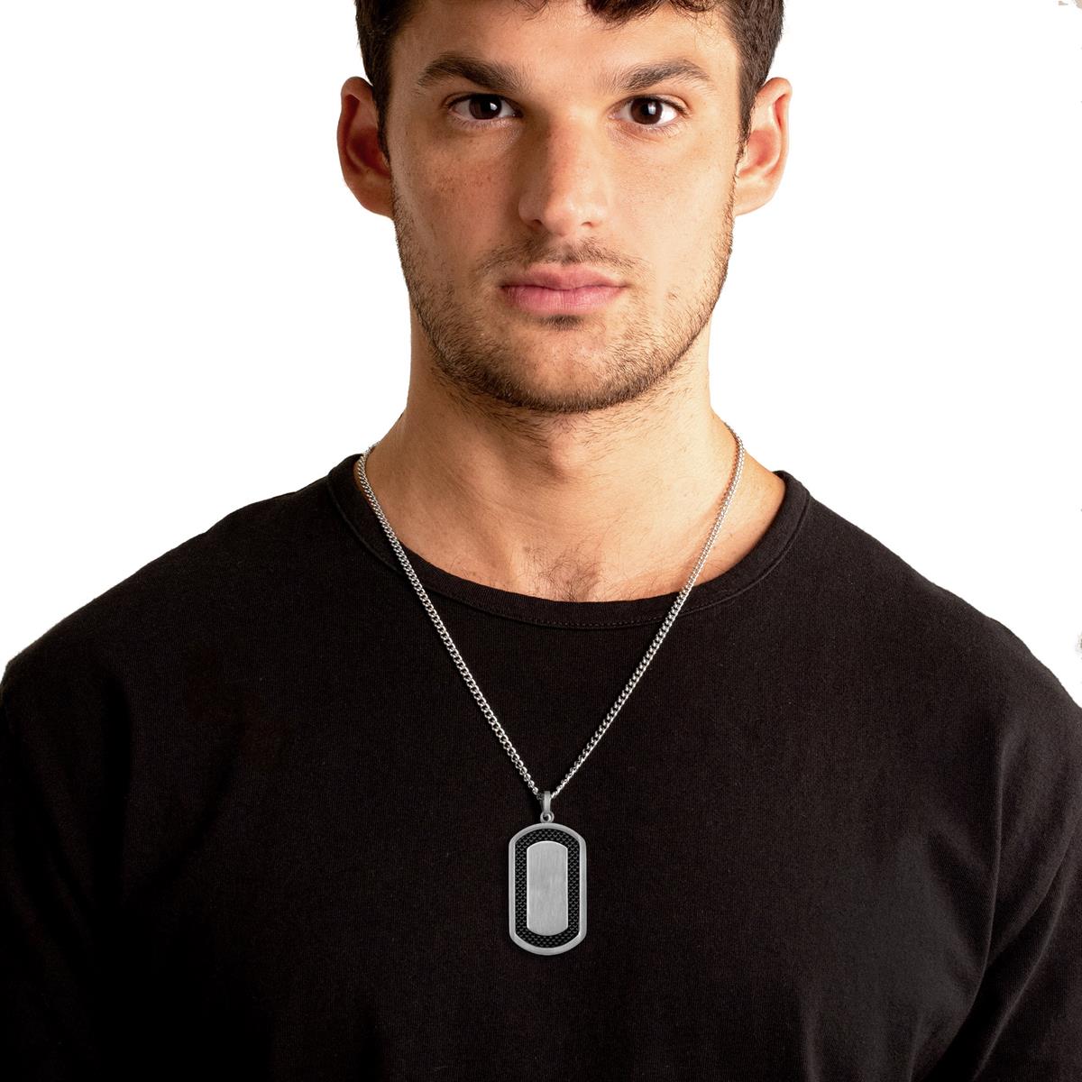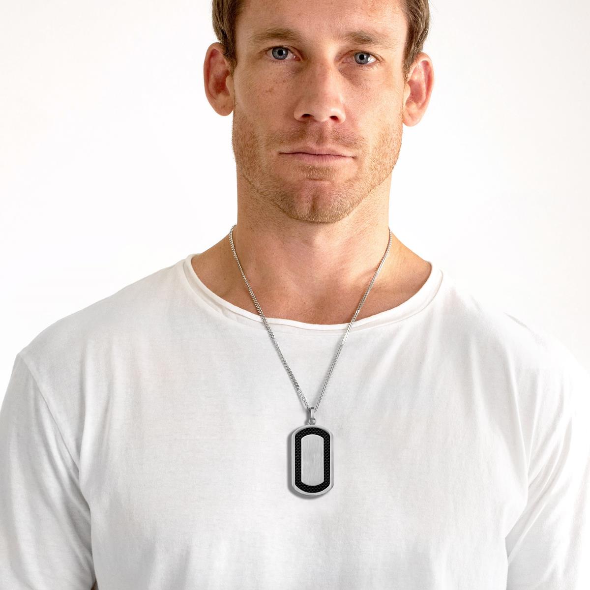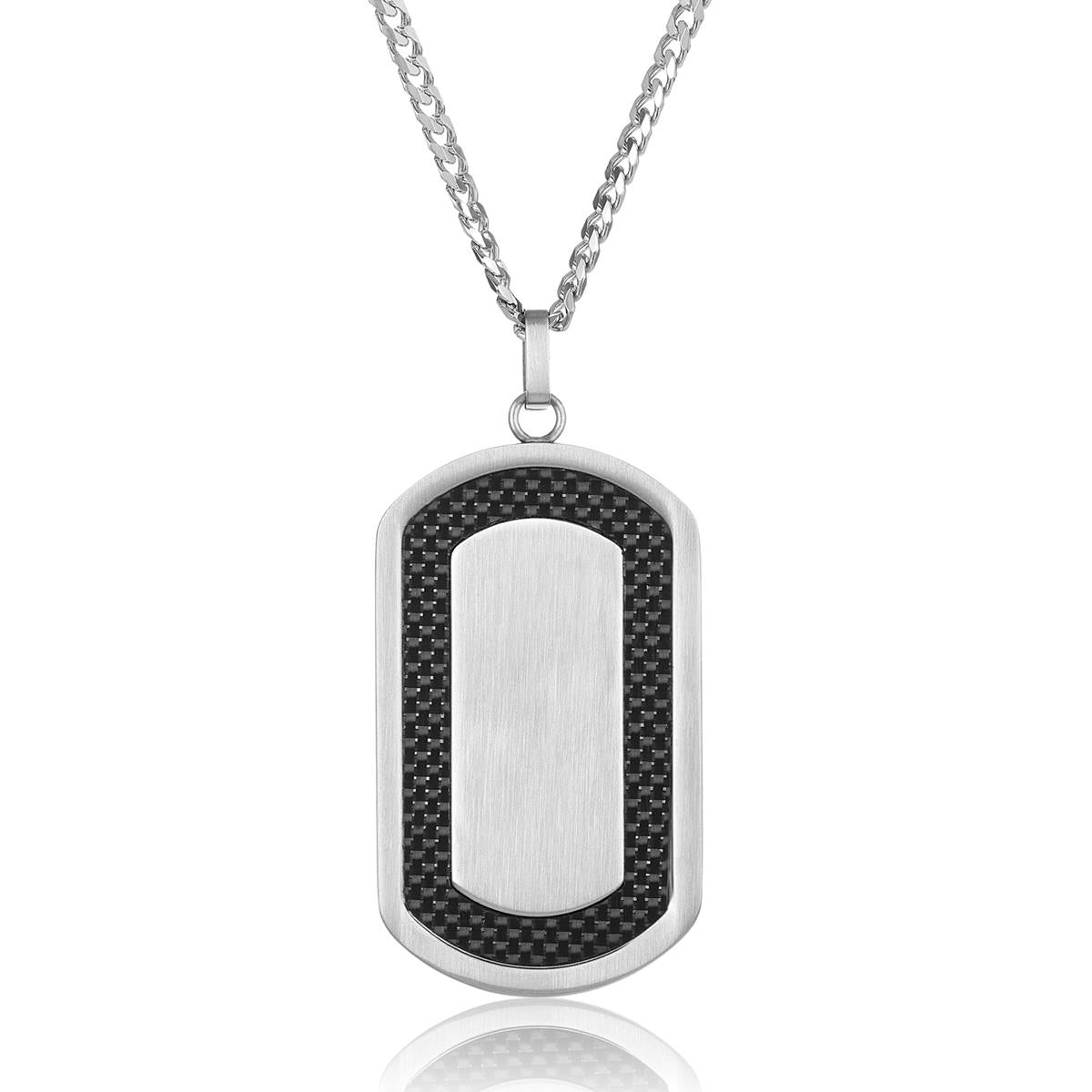 Sleek and modern, this satin finished stainless steel dog tag pendant is framed with carbon fiber. The dog tag has smooth rounded edges and comes complete with a 24 inch chain.