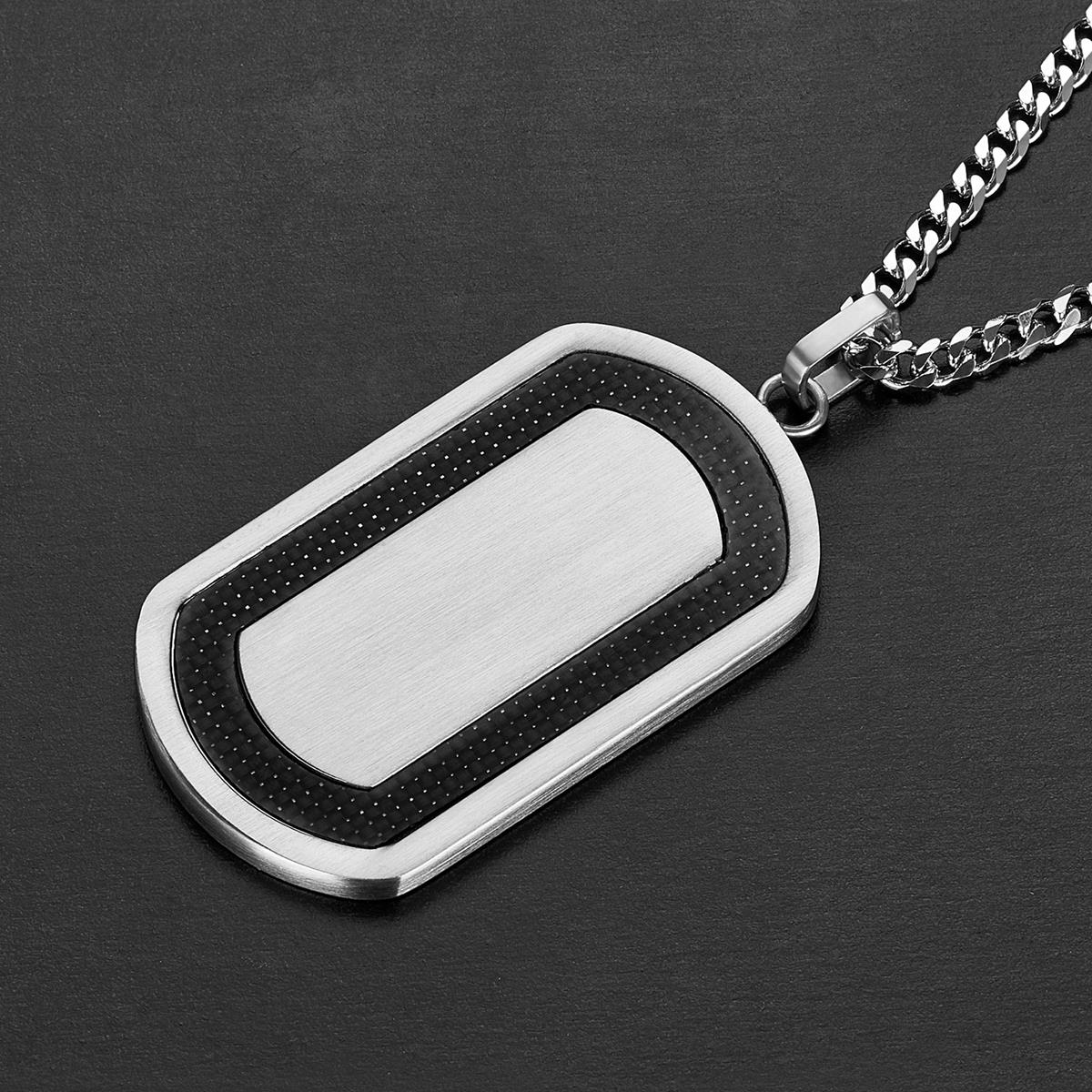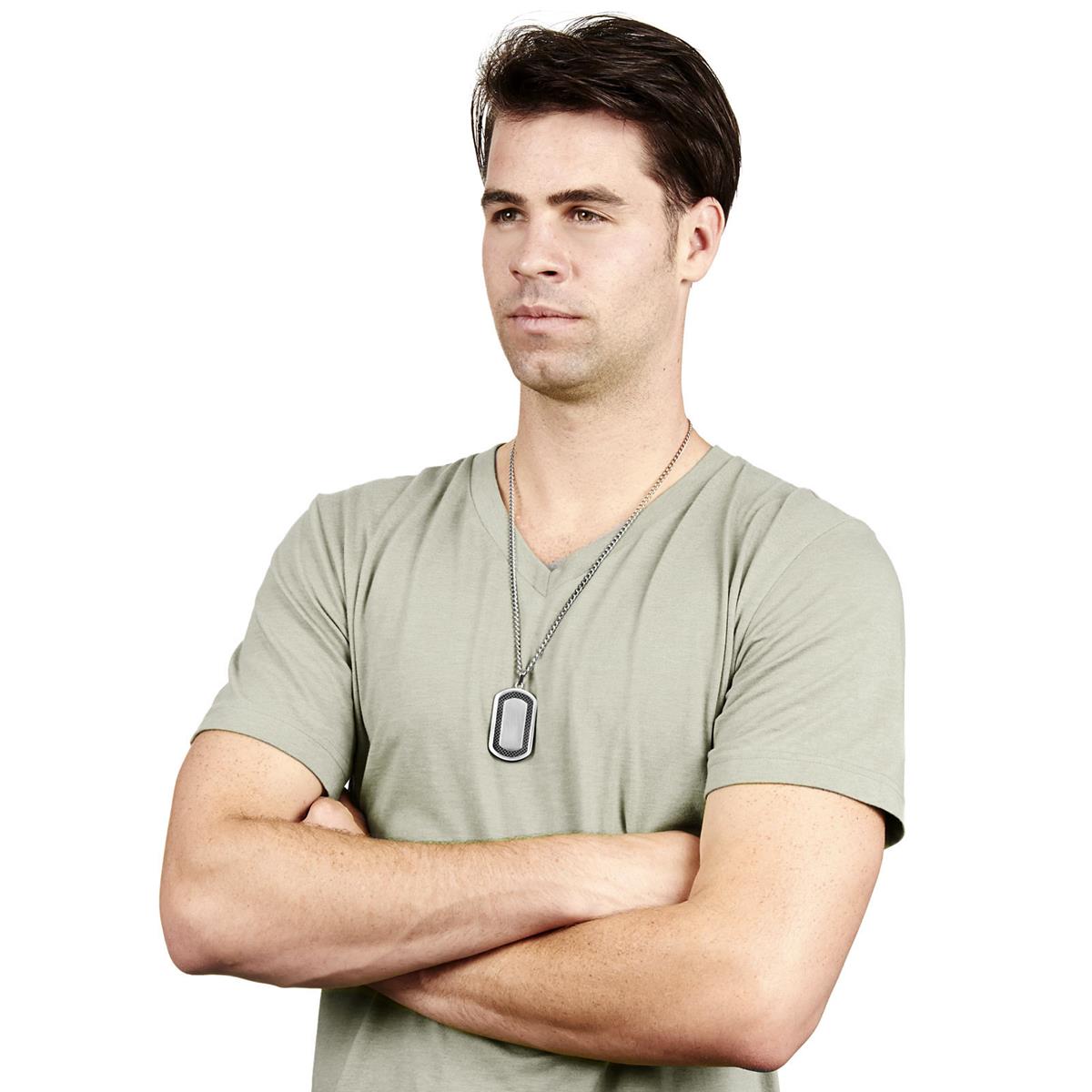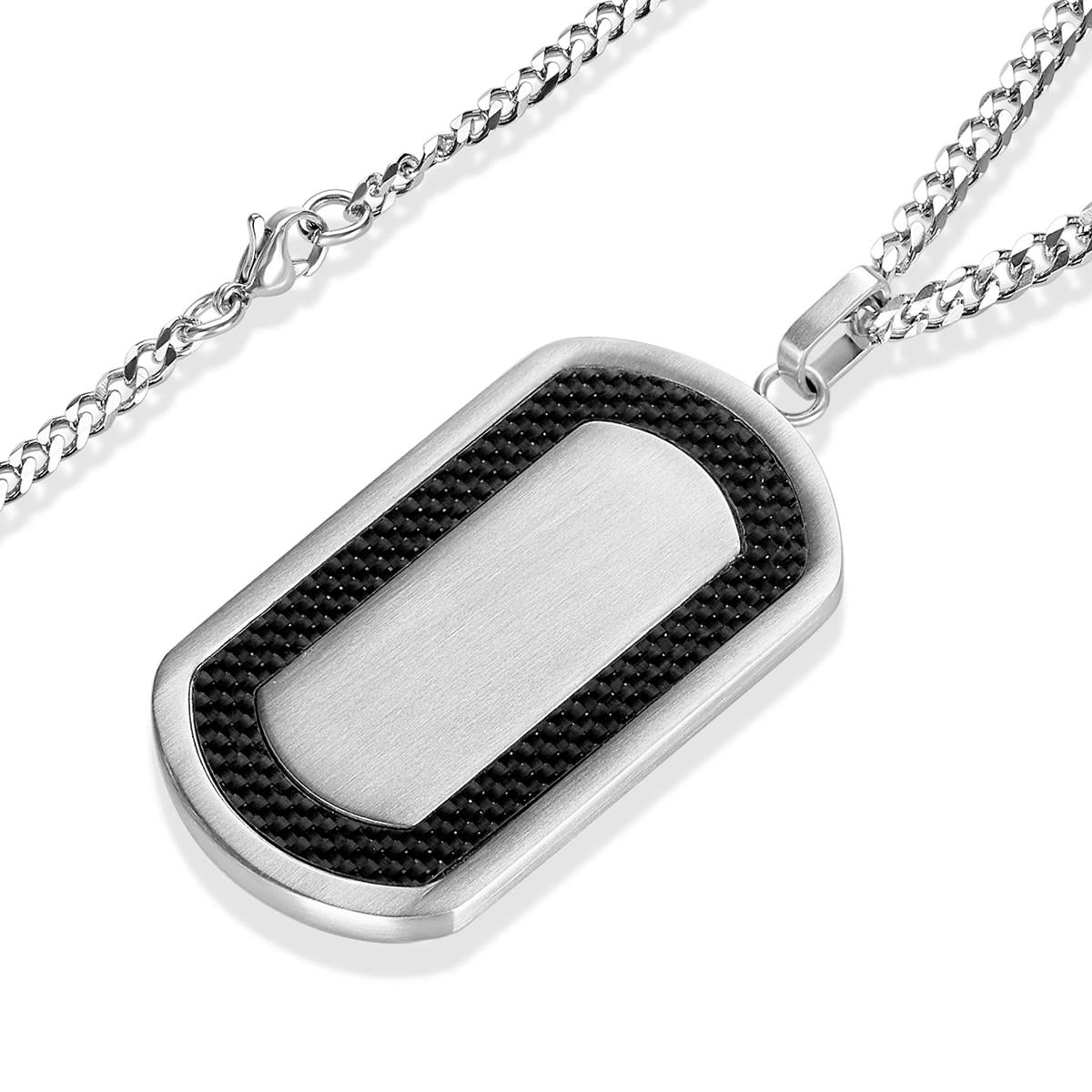 Sleek and modern, this satin finished stainless steel dog tag pendant is framed with carbon fiber. The dog tag has smooth rounded edges and comes complete with a 24 inch chain.