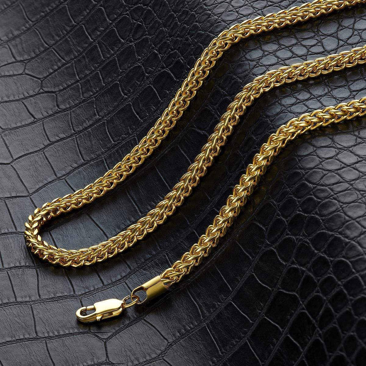 The necklace has a width of 5mm or 3/16 inches, and a thickness of 5mm or 3/16 inches. The length of the Franco Chain is 24 inches.