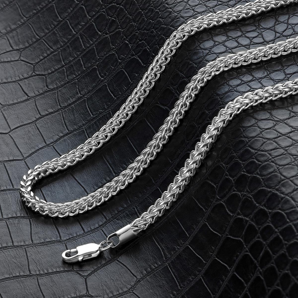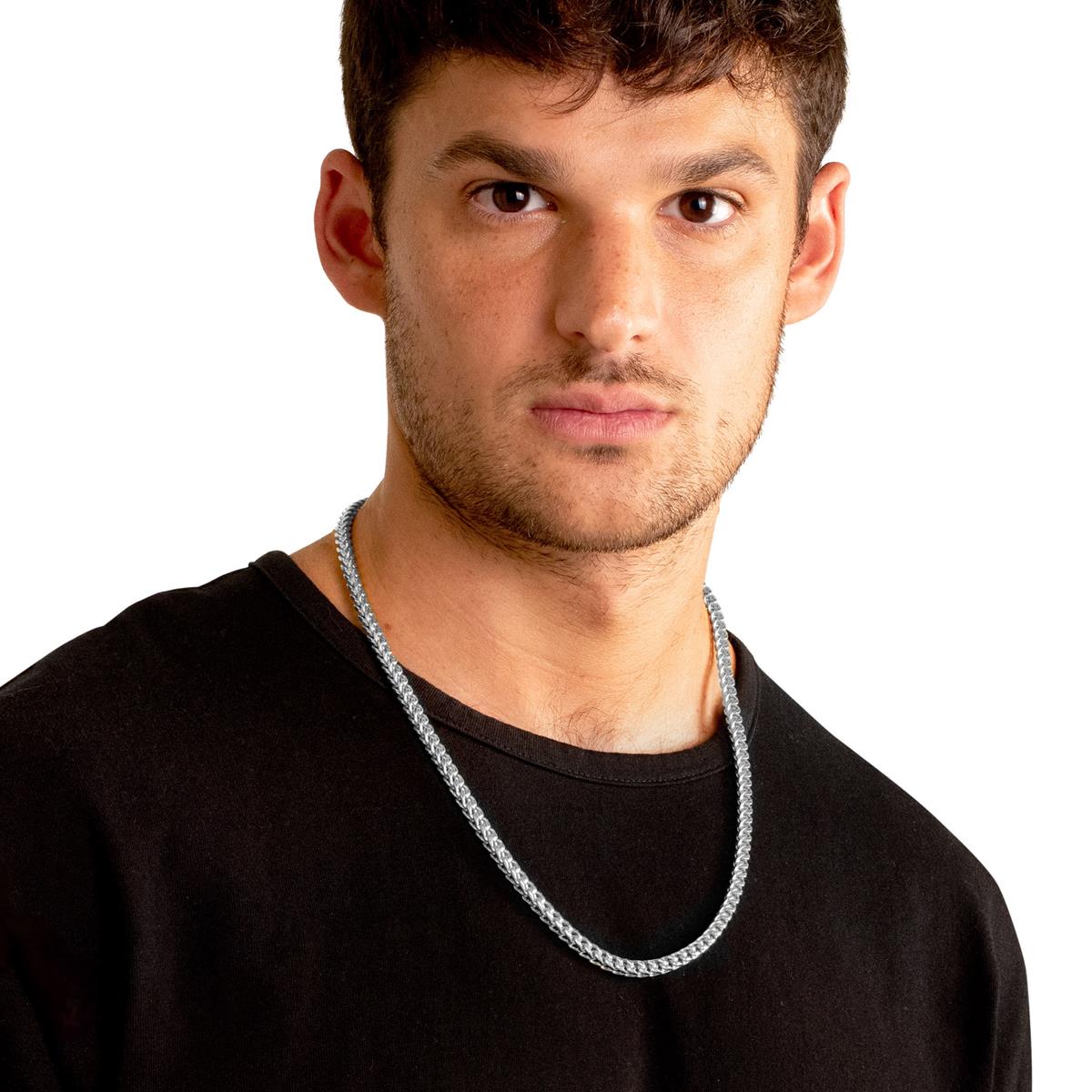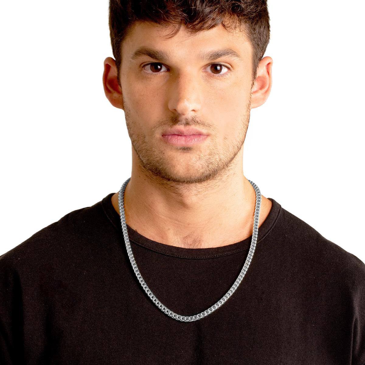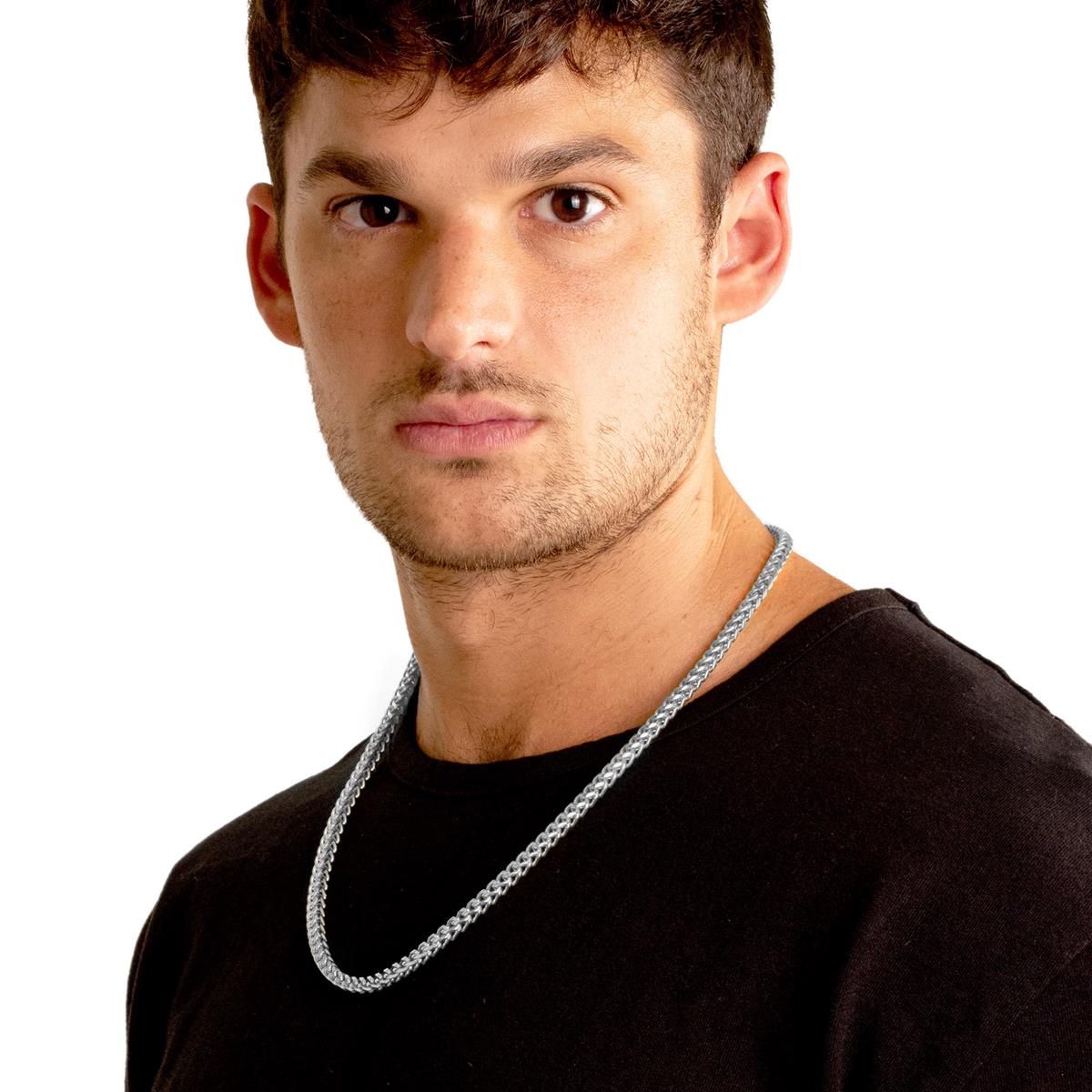 The necklace has a width of 5mm or 3/16 inches, and a thickness of 5mm or 3/16 inches. The length of the Franco Chain is 24 inches.