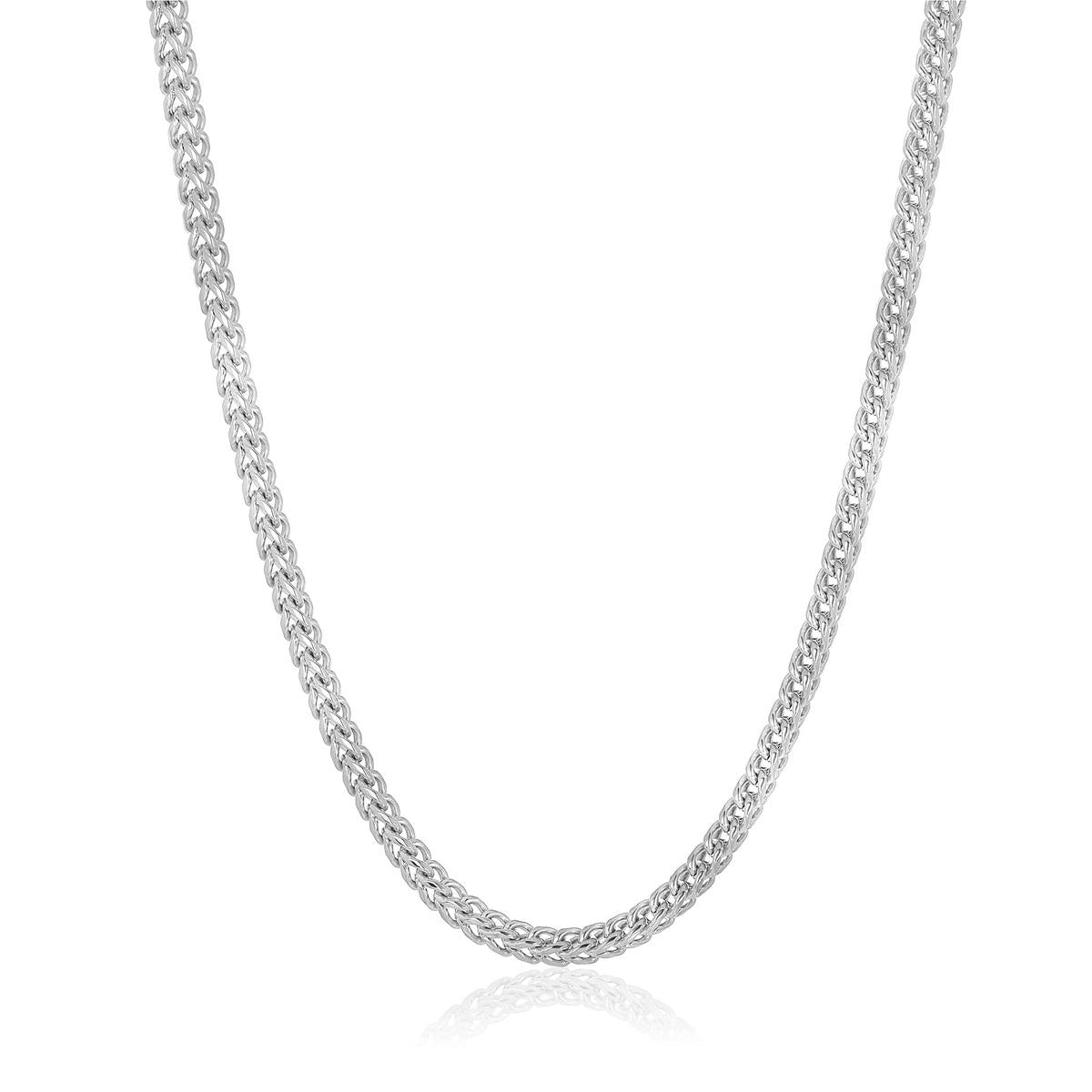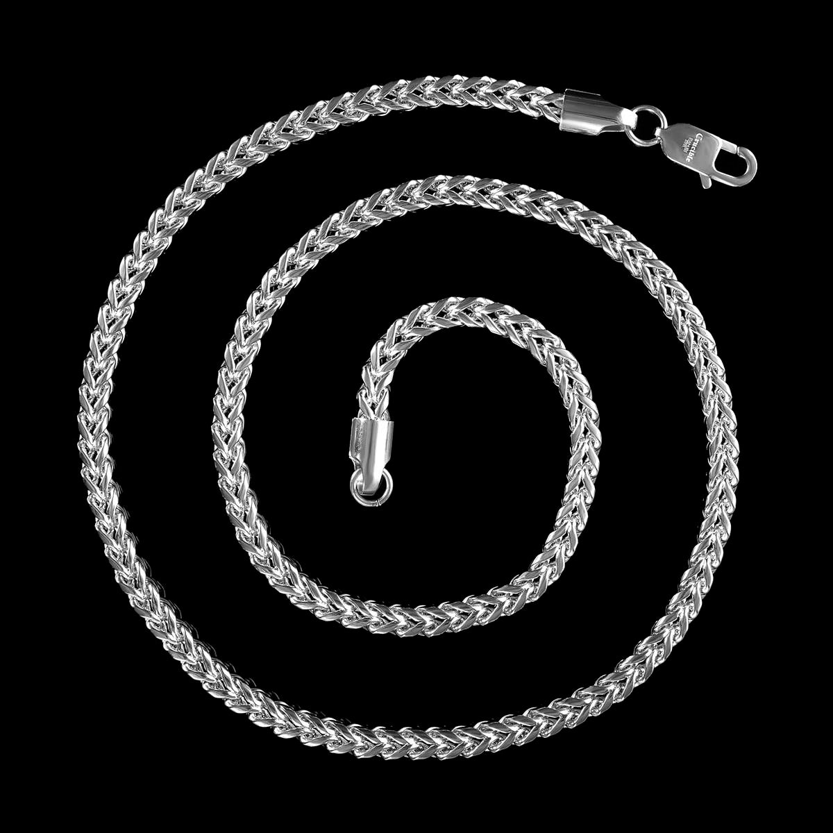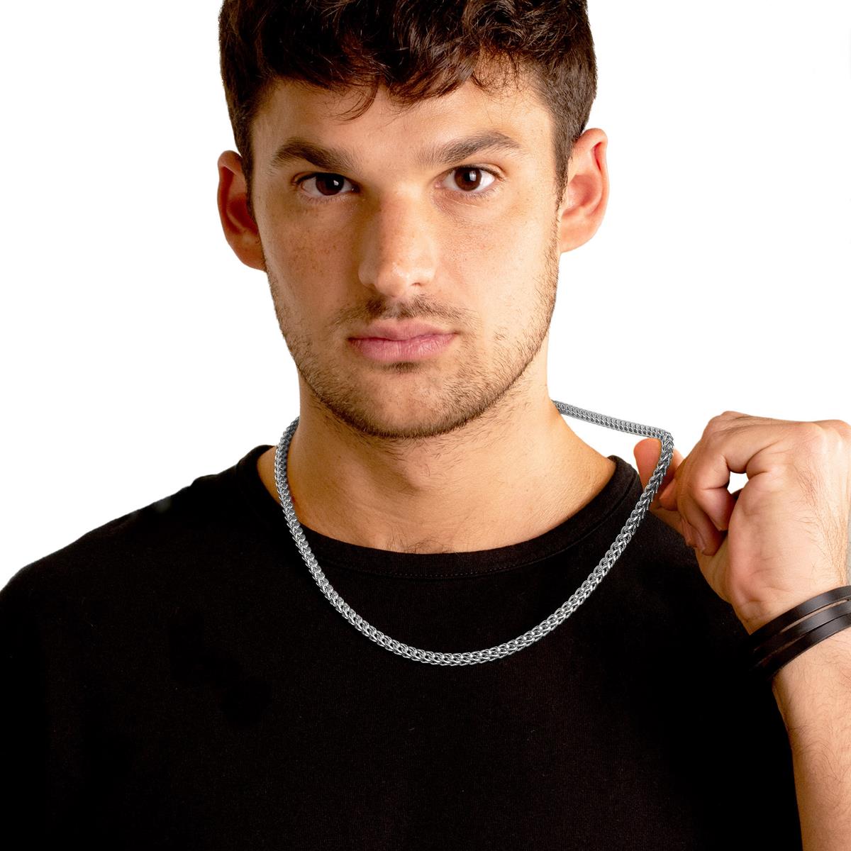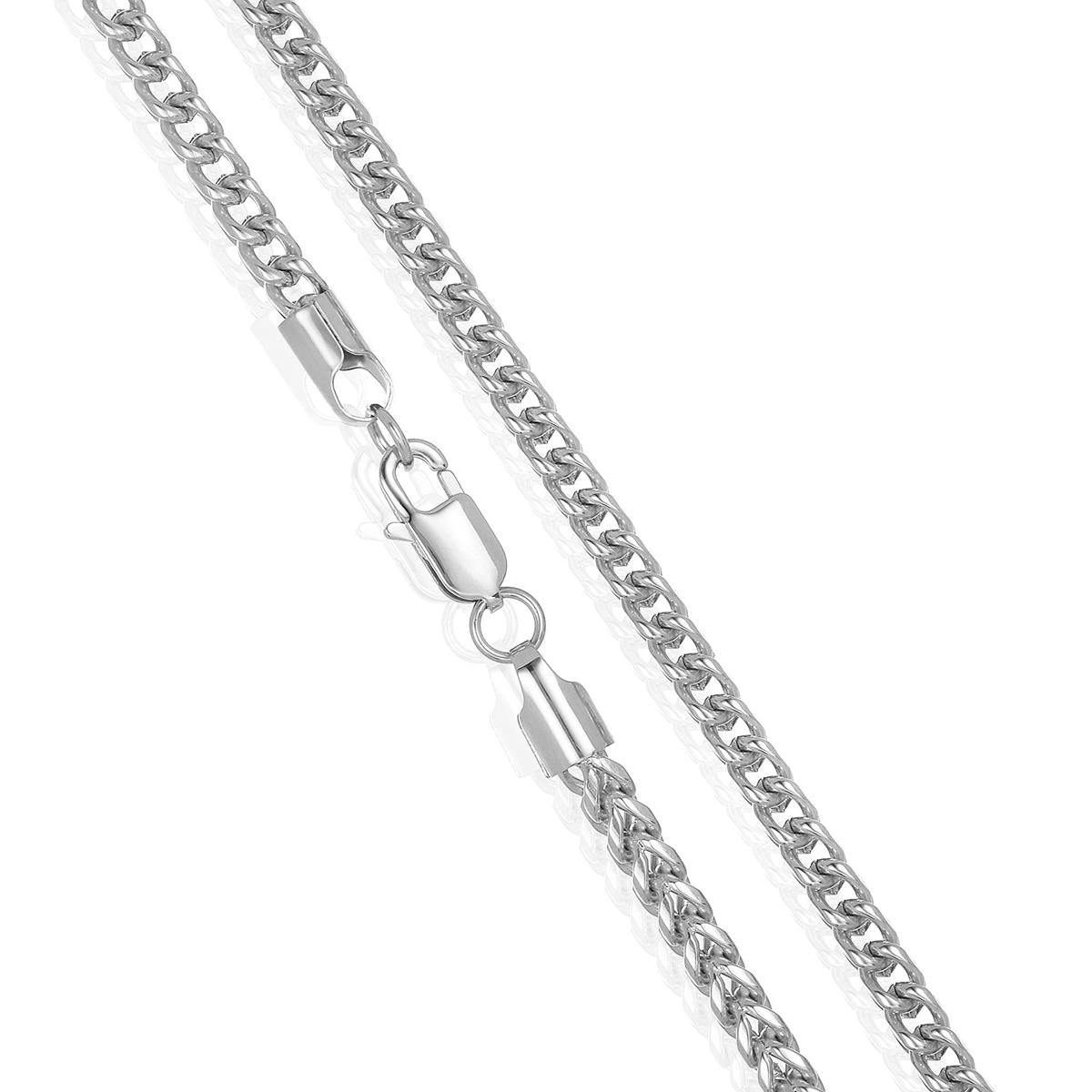 The necklace has a width of 5mm or 3/16 inches, and a thickness of 5mm or 3/16 inches. The length of the Franco Chain is 24 inches.