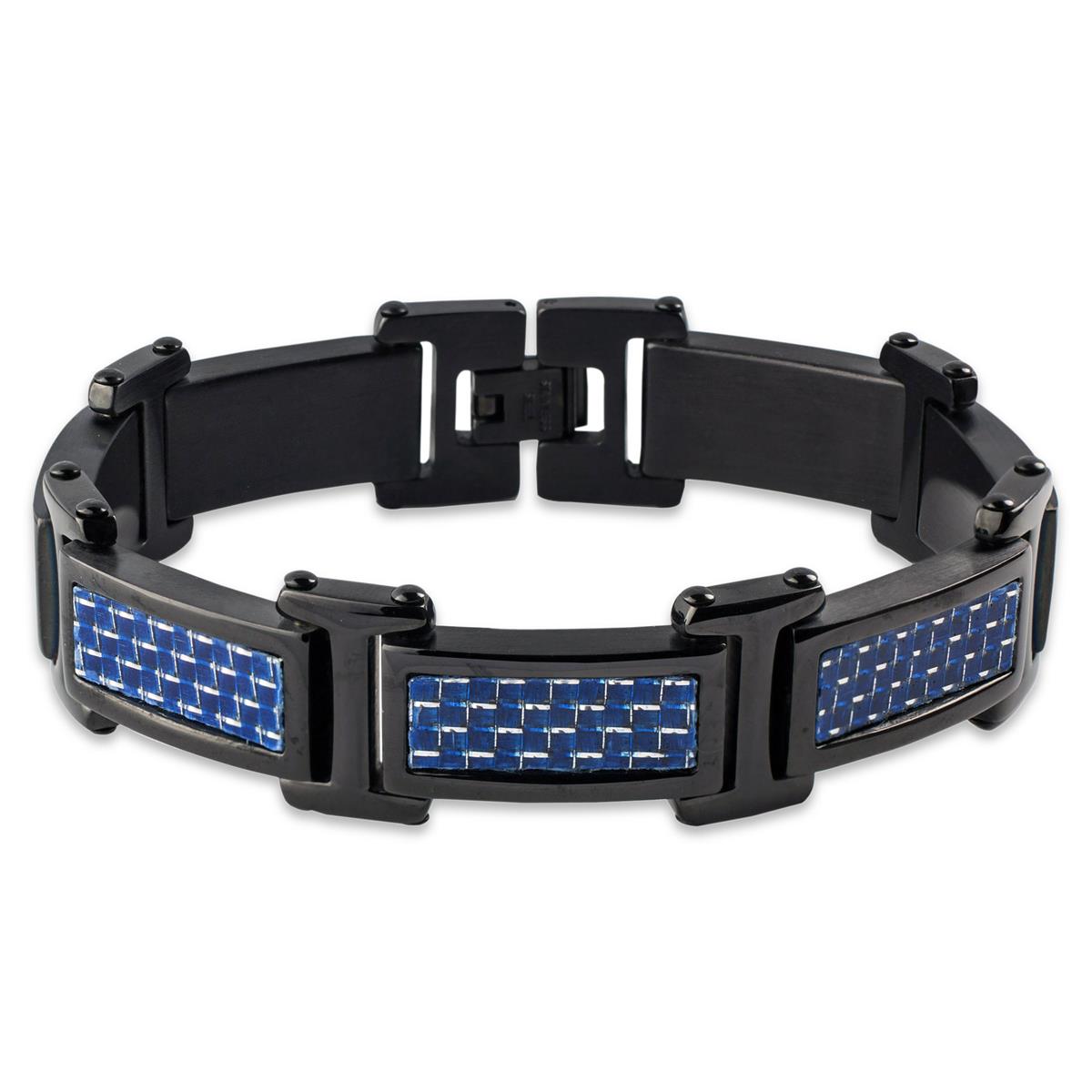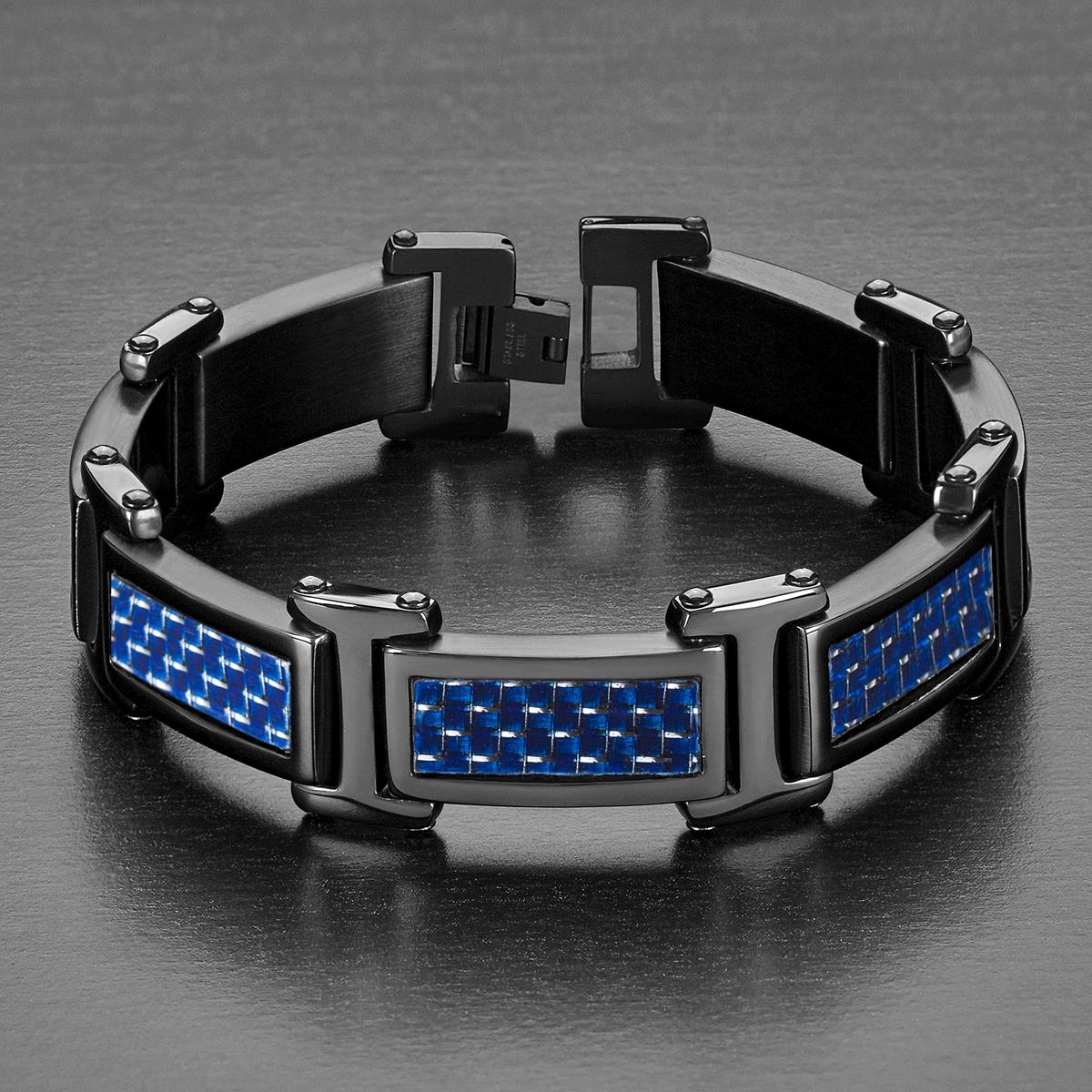 Add this Crucible Men's Jewelry Black Plated Stainless Steel Blue Carbon Fiber Link Bracelet to your choice of daily wear. The black plated bracelet is crafted with durable stainless steel and is inlaid with blue carbon fiber links. The bracelet length is 8.5 inches with an inner circumference of 7.5 inches.