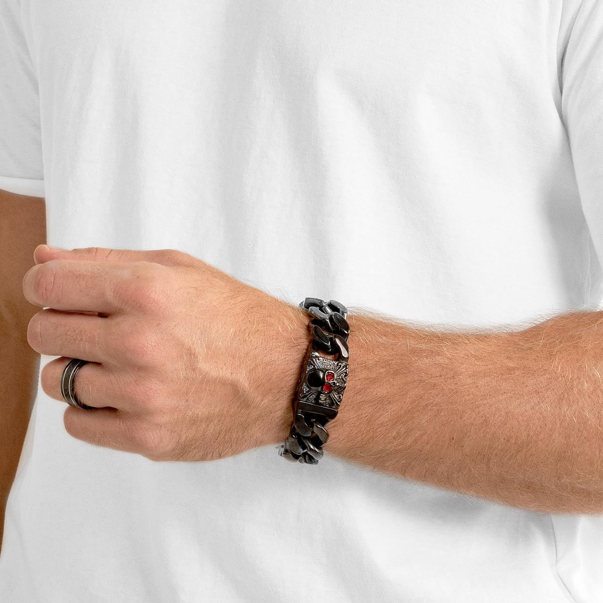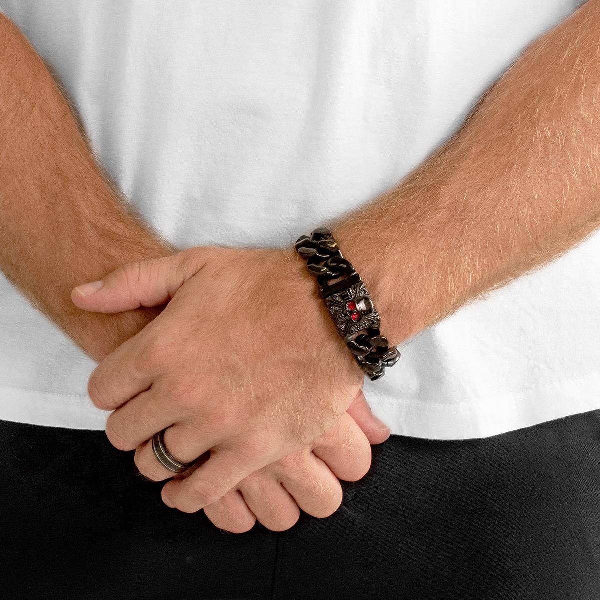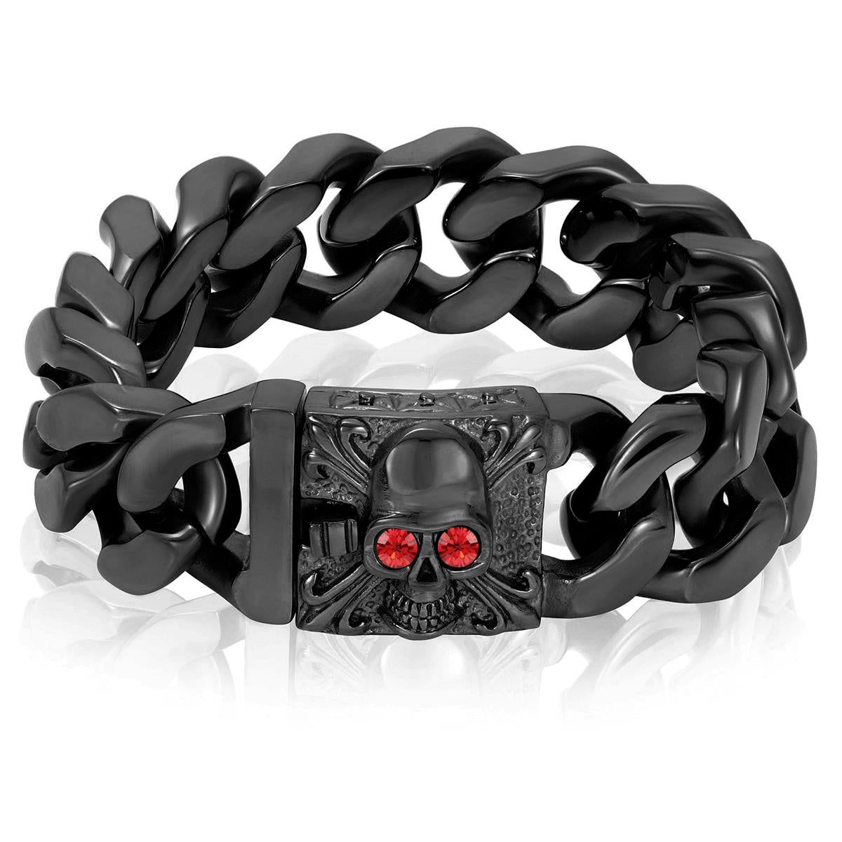 Wear this Crucible Men's Jewelry Black Plated Stainless Steel Skull Curb Link Bracelet with any style. The bracelet has a skull clasp paired with curb links that will give your wrist a tough look. Each eye on the skull design has a cubic zirconia stone to give the entire piece an eye catchy design. The durable stainless steel bracelet has a width of 20mm or 13/16 inches. The piece is available in two lengths to select from.