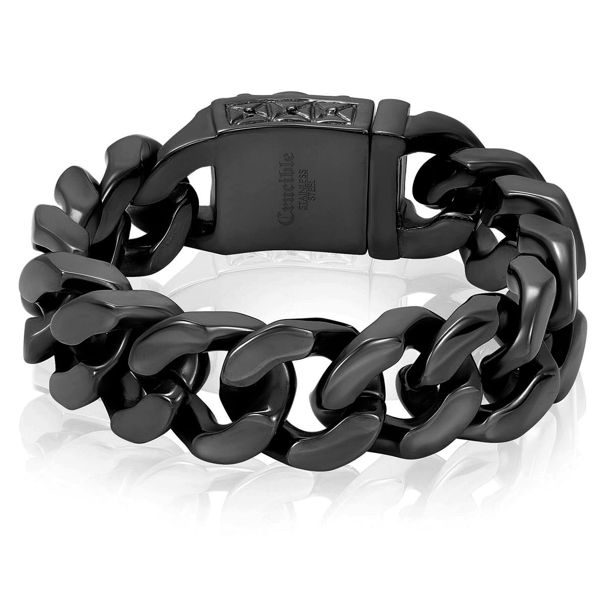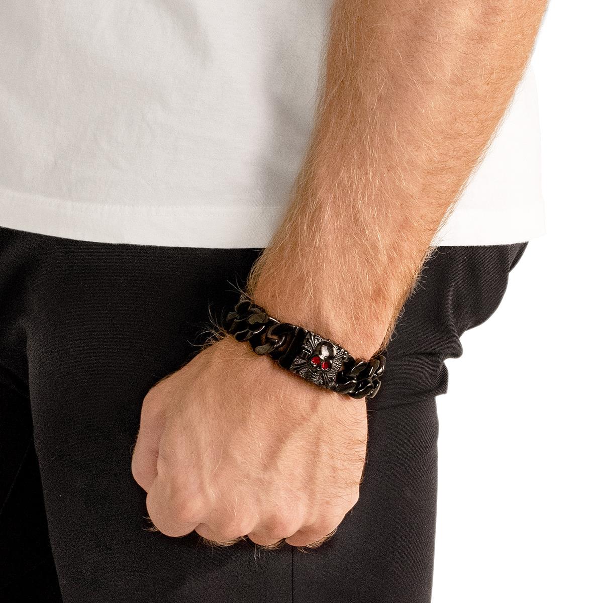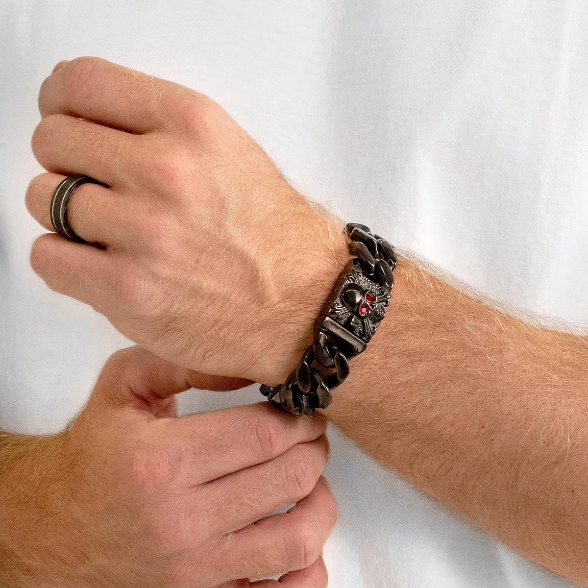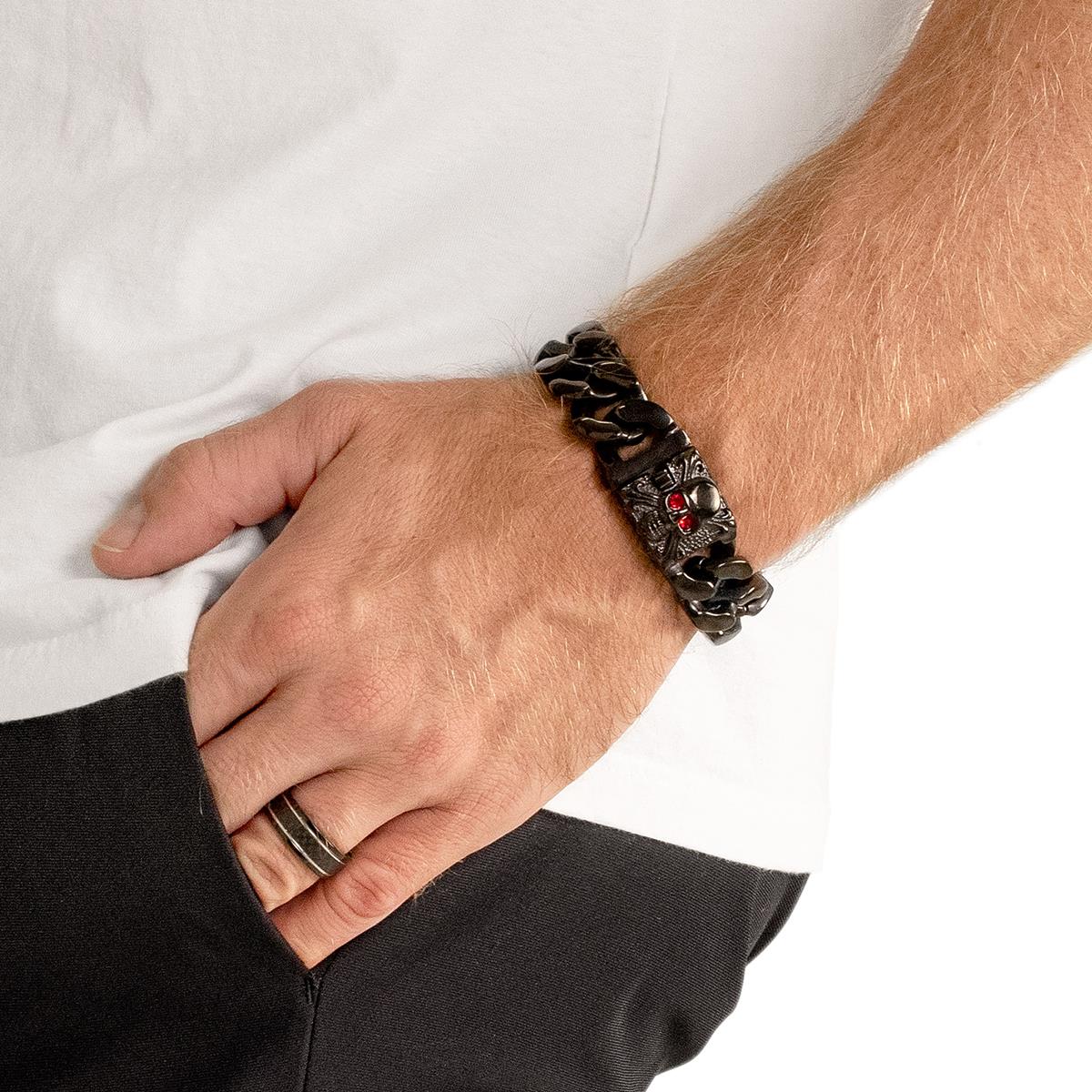 Wear this Crucible Men's Jewelry Black Plated Stainless Steel Skull Curb Link Bracelet with any style. The bracelet has a skull clasp paired with curb links that will give your wrist a tough look. Each eye on the skull design has a cubic zirconia stone to give the entire piece an eye catchy design. The durable stainless steel bracelet has a width of 20mm or 13/16 inches. The piece is available in two lengths to select from.