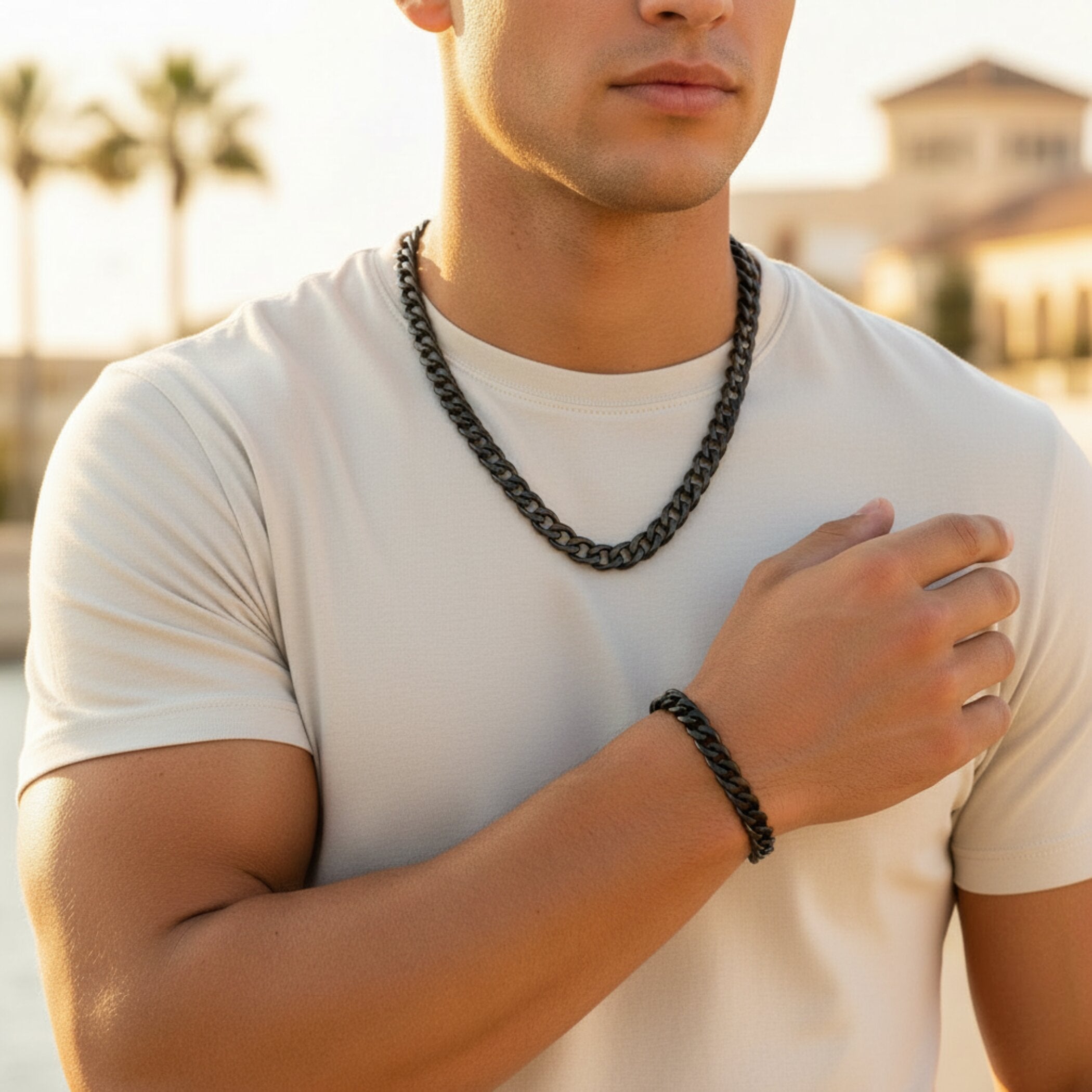Crucible Men's Bracelet and Necklace Black Plated Steel Curb Chain Set