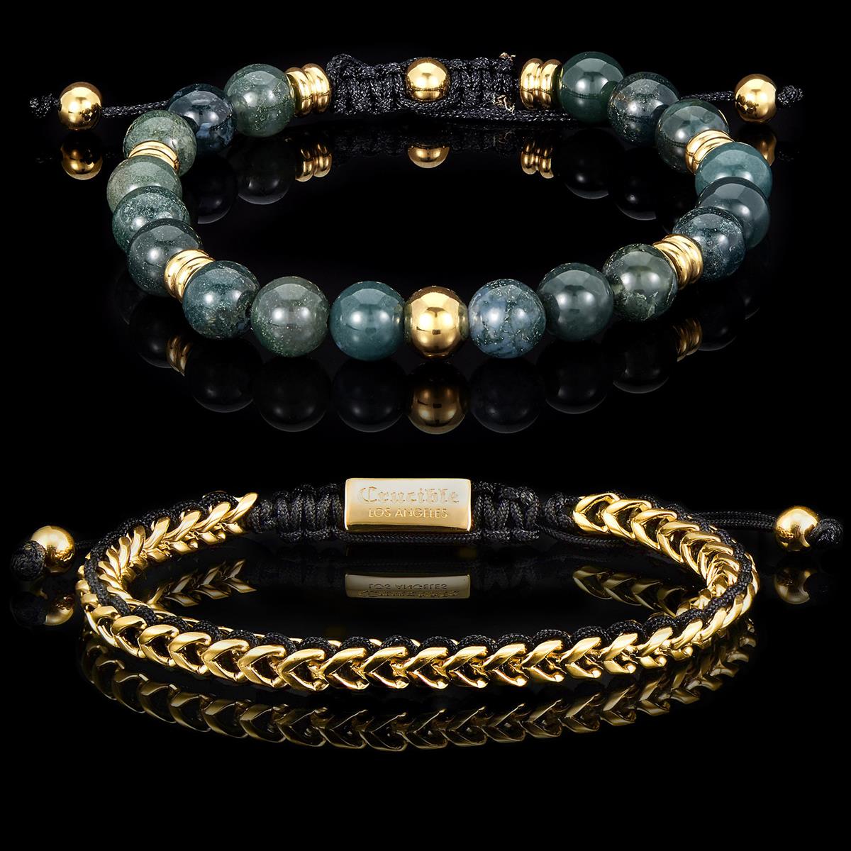 Bundle Includes: 8mm Moss Agate and Gold IP Beads on Adjustable Cord Tie Bracelet + Gold 6mm Franco Chain Bracelet with Woven Black Cord on Shocker Tie