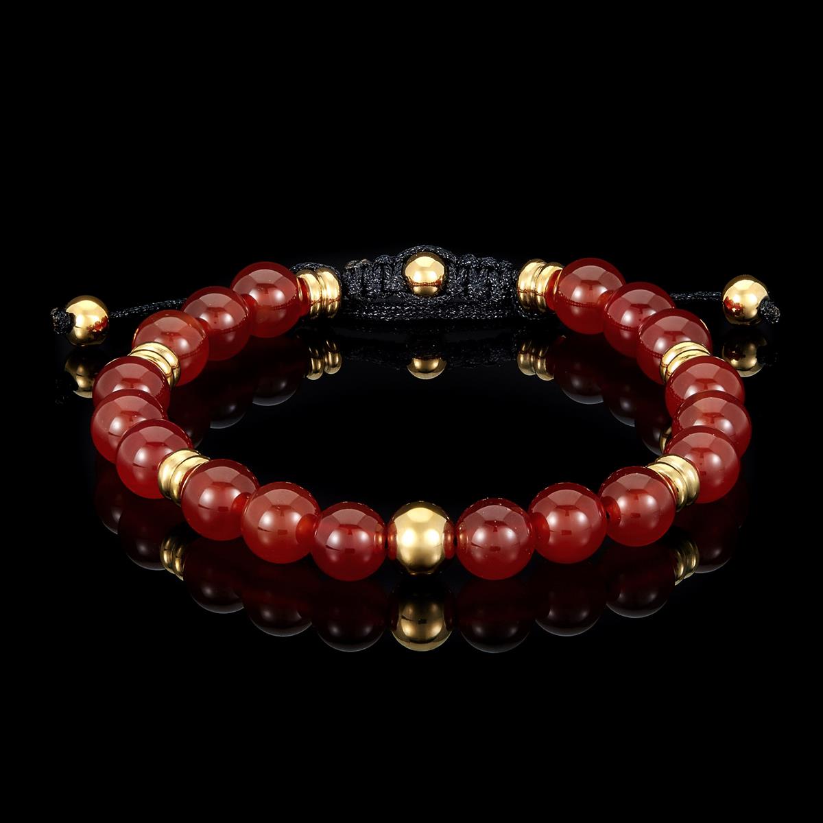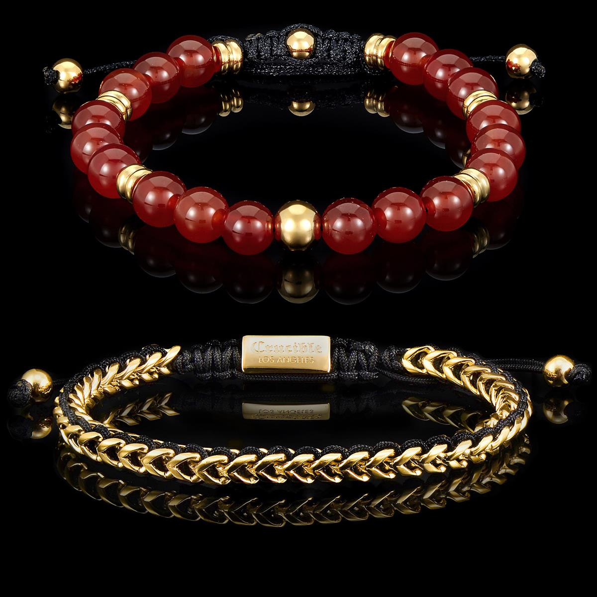 Bundle Includes: 8mm Red Agate and Gold IP Beads on Adjustable Cord Tie Bracelet + Gold 6mm Franco Chain Bracelet with Woven Black Cord on Shocker Tie