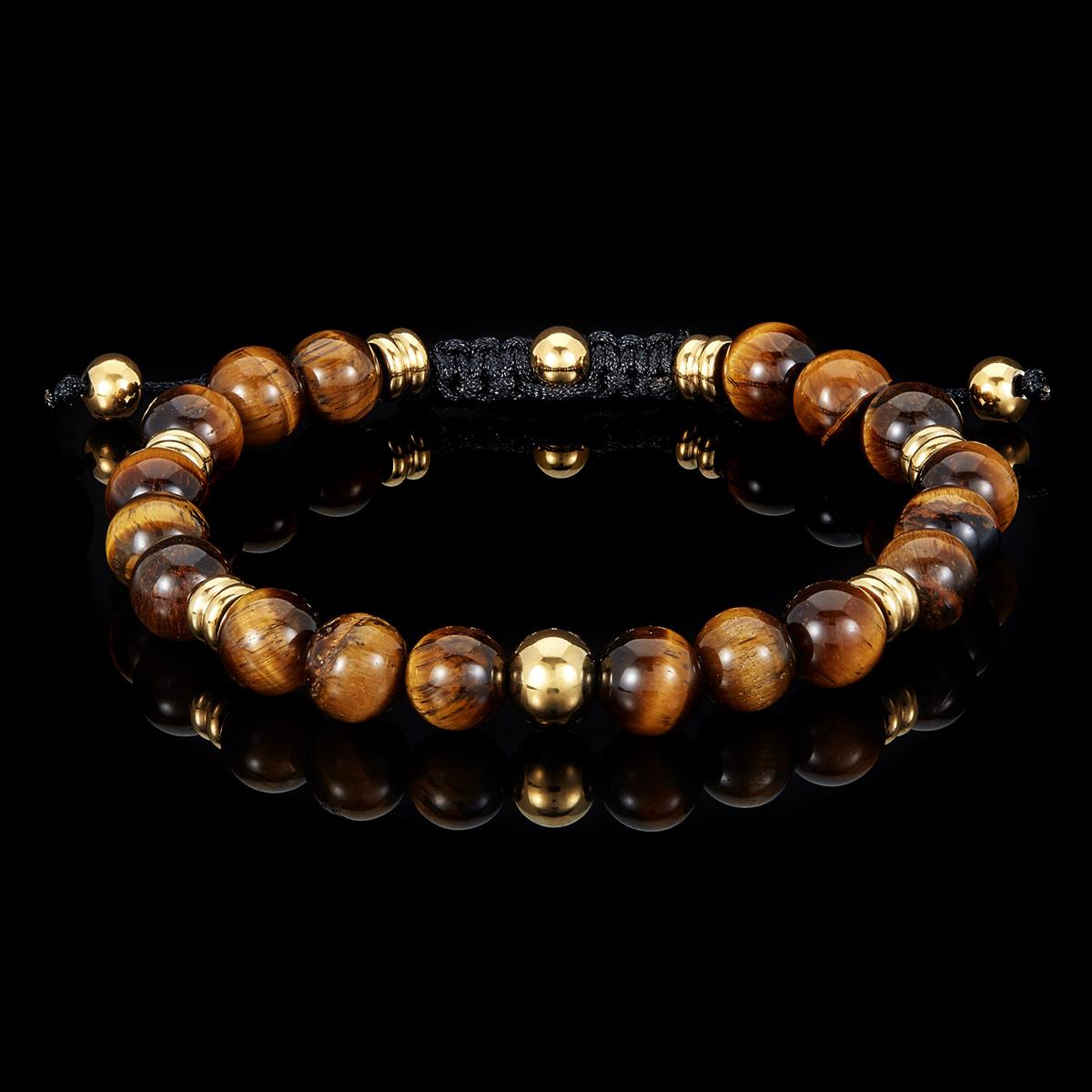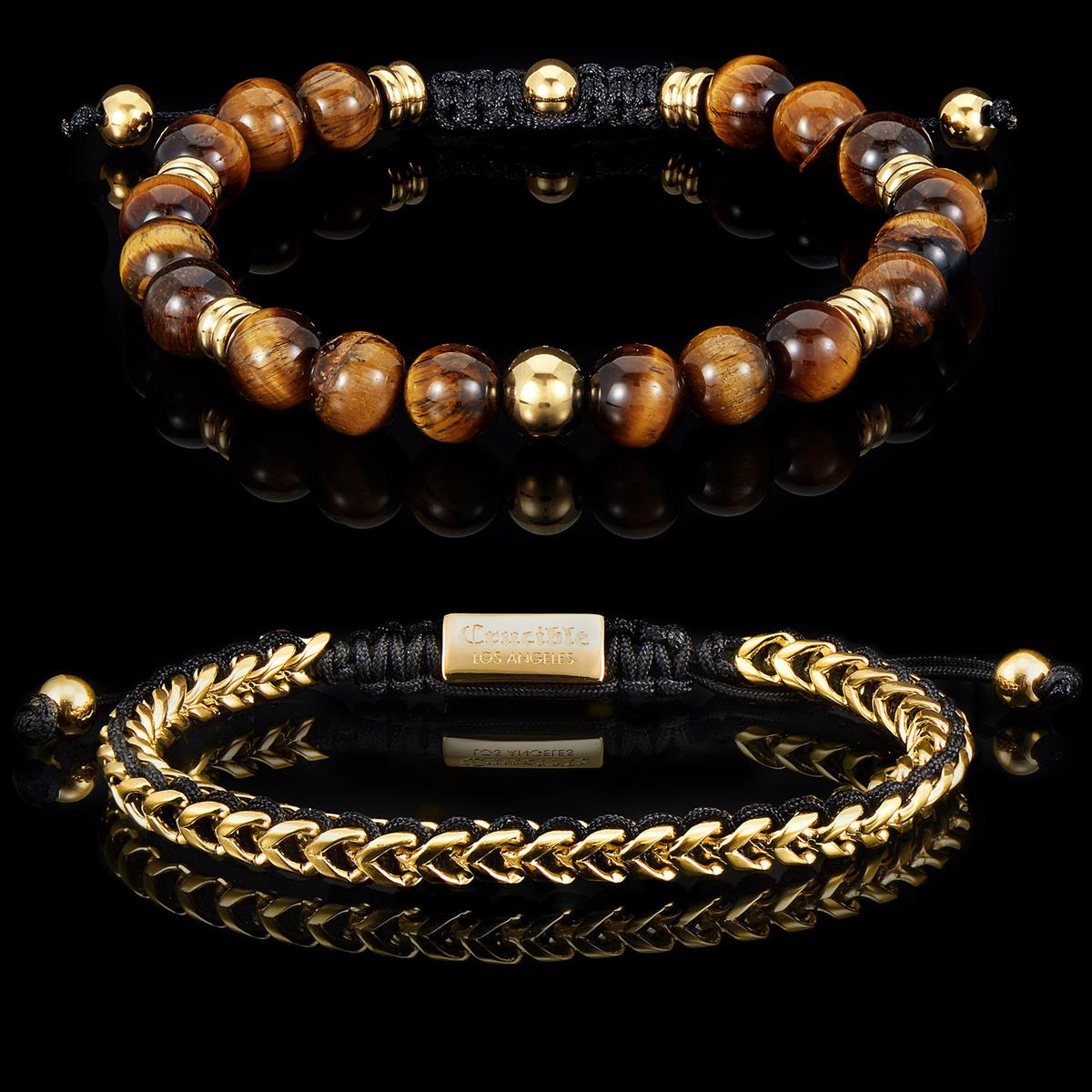 Bundle Includes: 8mm Tiger Eye and Gold IP Beads on Adjustable Cord Tie Bracelet + Gold 6mm Franco Chain Bracelet with Woven Black Cord on Shocker Tie