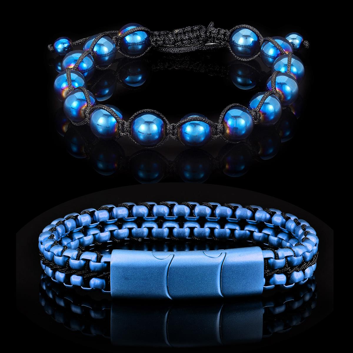 Bundle Includes: Blue IP Hematite Stone Beaded Adjustable Bracelet (10mm) + Blue Matte Finish Double Row Box Chain Bracelet with Black Nylon Cord