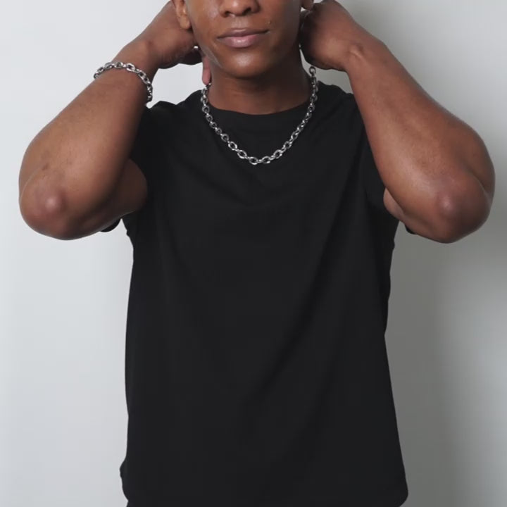 Complete your stylish look when wearing this unique chain set. The set is crafted with durable stainless steel and features oval shaped links. The polished finish with the knife cut edges create an eye catching design that'll pair perfectly with your favorite accessories.