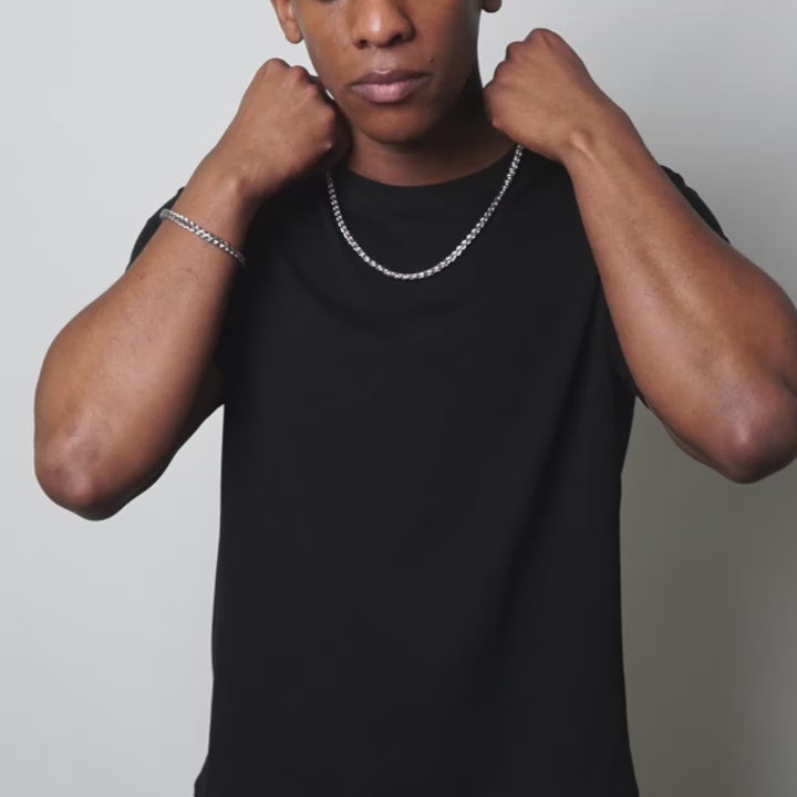 Complete any look when wearing this sleek Invicta Jewelry Men's Chain Set. The chain set is crafted with durable stainless steel offering a long-lasting wear. The bracelet has a Franco chain design and the necklace has a Curb chain design both with a polished finish. Each piece has a width of 6 millimeters and fasten with lobster clasps.
