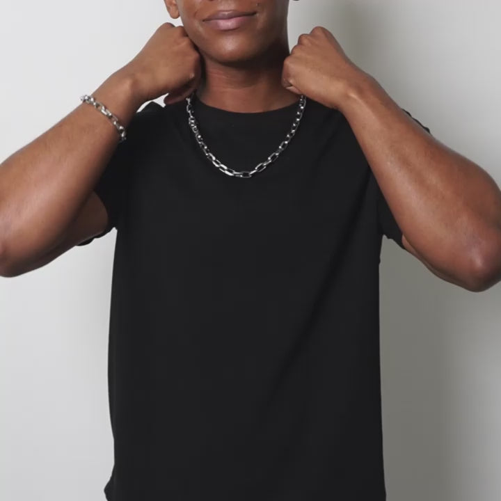 The bracelet has a wearable length of 9 inches and the necklace has a wearable length of 24 inches. The width of both pieces is 10 millimeters and fasten with a large rectangular lobster claw clasp.
