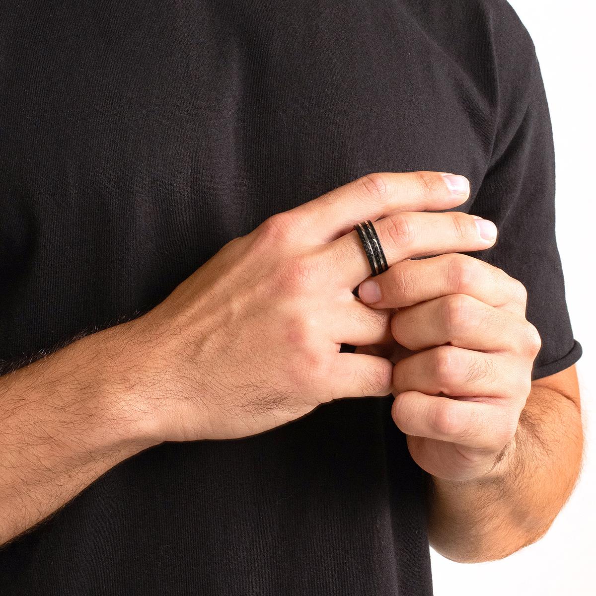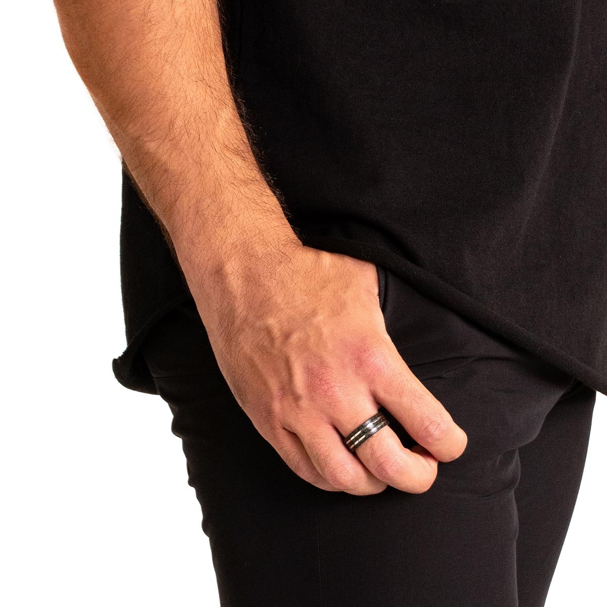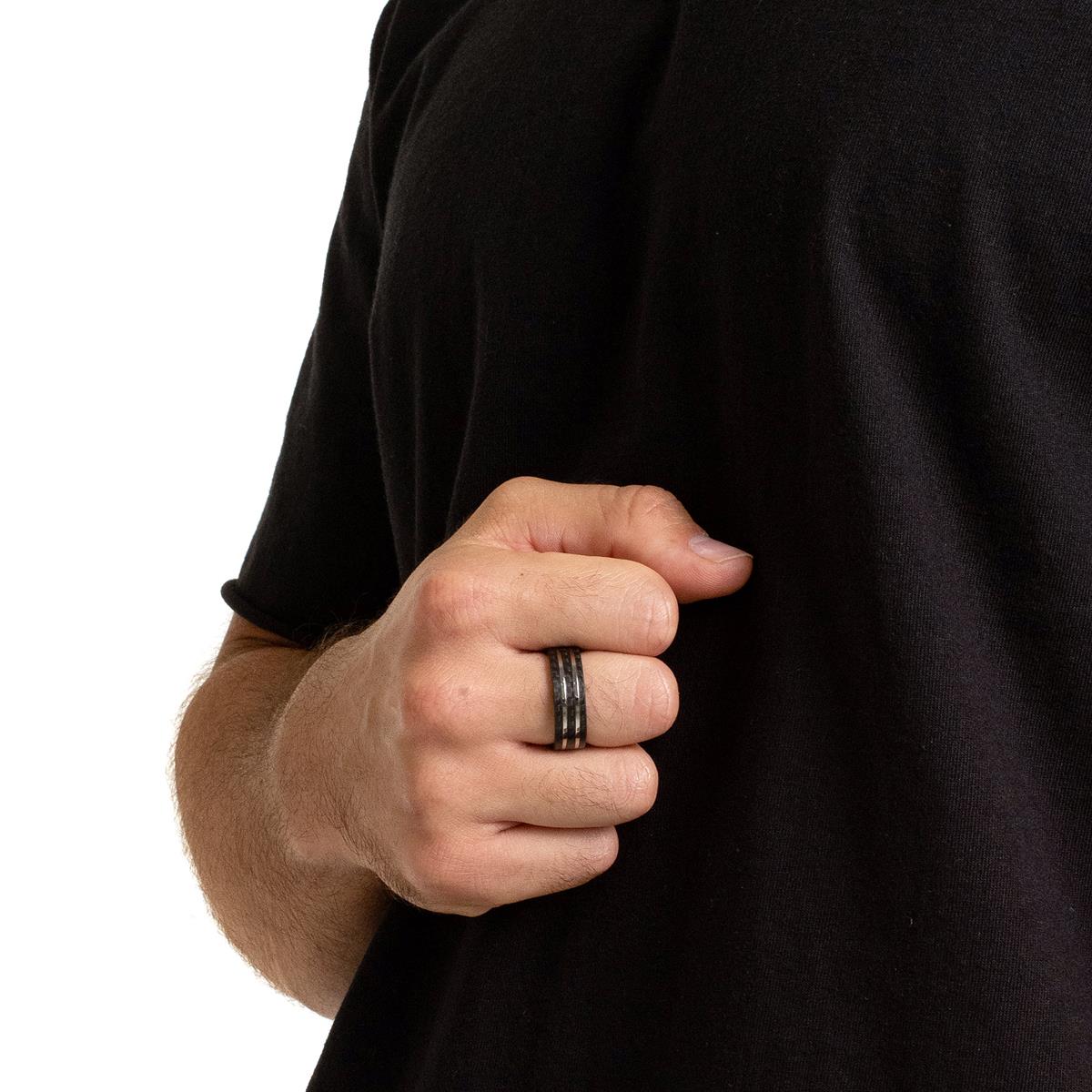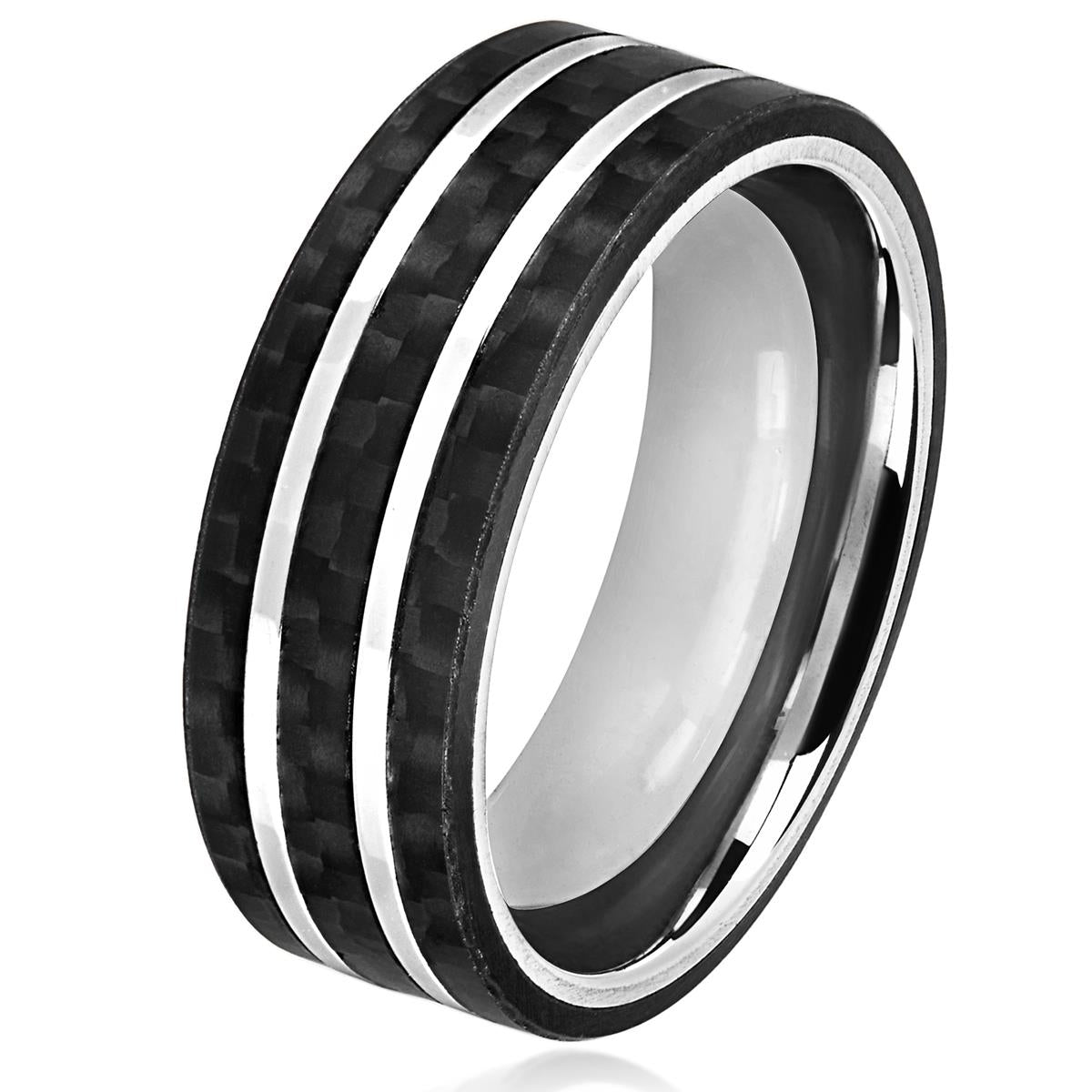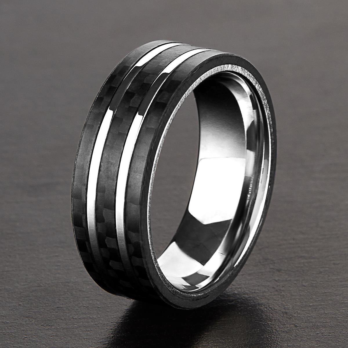 Make a modern fashion statement and make sure all eyes are on you when you wear this sharp and handsome men's stainless steel band. This men's jewelry item features a high polish stainless steel band with triple matte black carbon fiber overlaid bands and sharp silver stripes. The contrasting and eye-catching carbon fiber detailing gives this men's ring a modern style while the sharp silver stripes accentuate this ring with sharpness and sophistication. Carbon fiber is a lightweight, durable high technology material. The carbon fiber and stainless steel construction enable this men's ring to withstand the everyday men's activities. This men's ring also offers versatility as it can be worn with a casual attire or a sharp formal attire. This men's ring design and construction yields maximum comfort. The inner shank is domed and polished for a comfort fit. The exterior band has a smooth surface for a soft touch on your adjacent fingers. This jewelry item measures 8mm wide by 2.4mm thick, and weighs 4.8 grams.