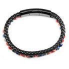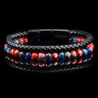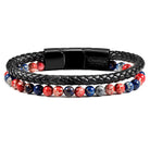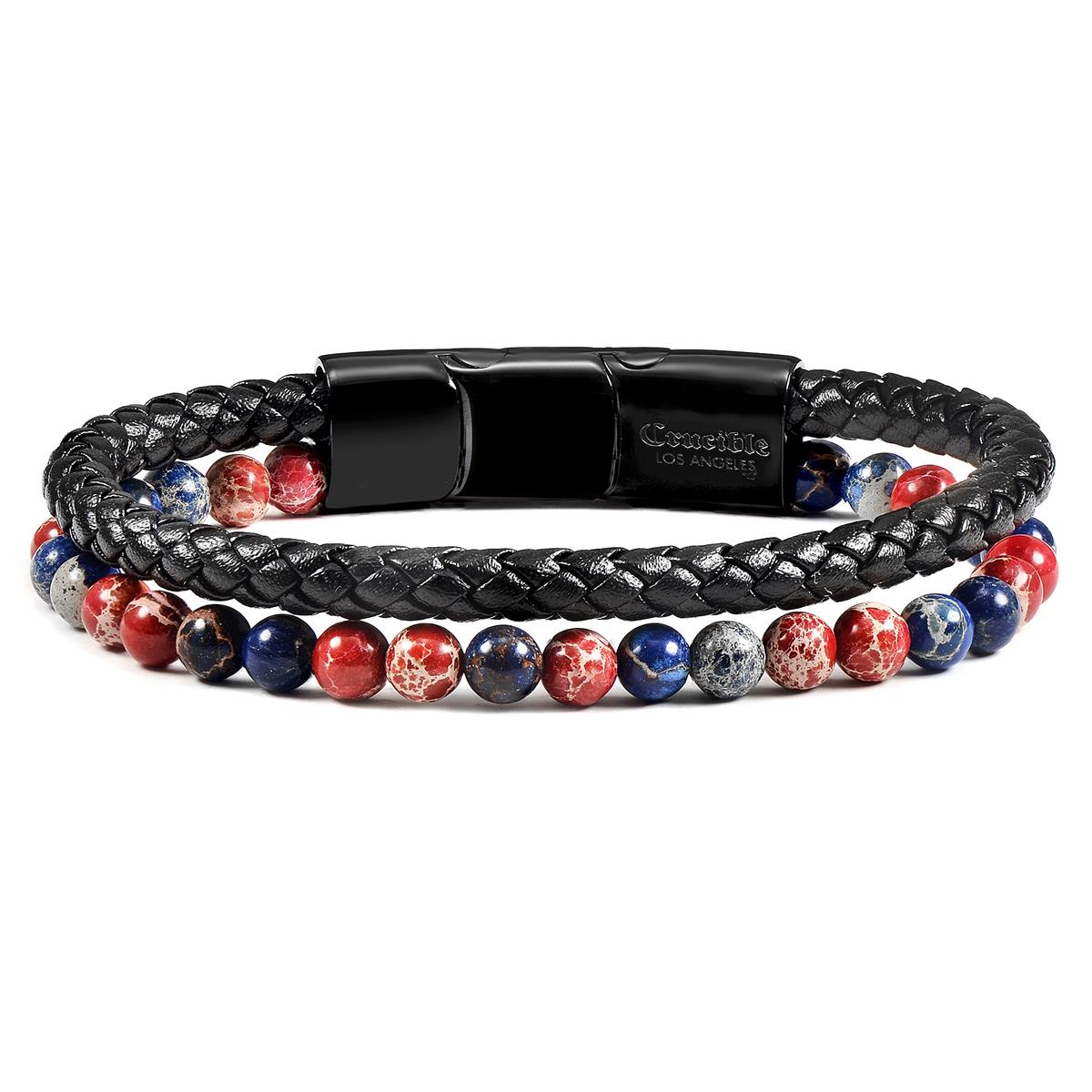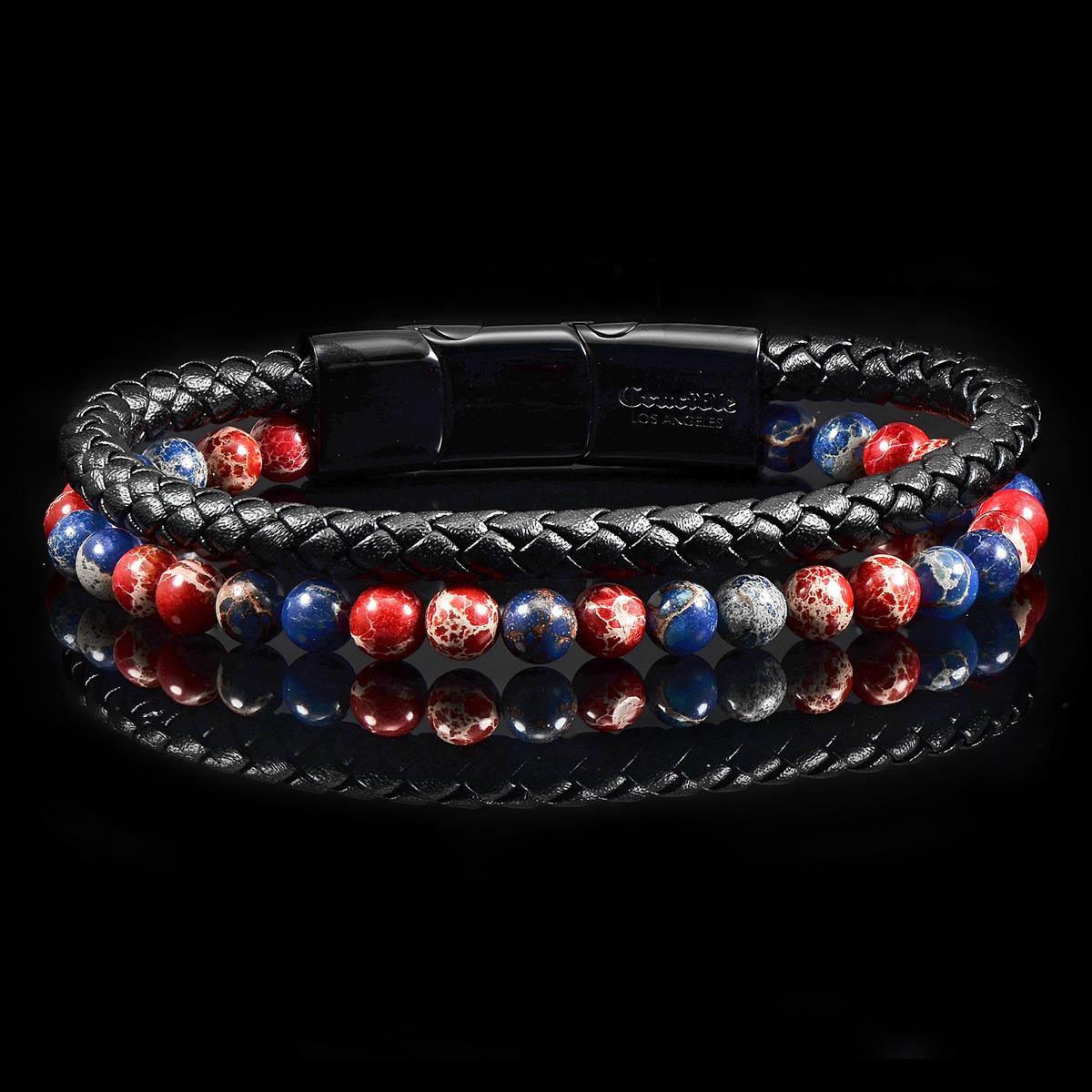 Wear this stylish Crucible Men's Jewelry leather and stone bracelet with any style. The bracelet has one black braided leather row, and the second row is a strand of natural stone beads. The alternating stone pattern consists of Red Imperial Jasper Stones and Blue Imperial Jasper stone beads. The bracelet comes together with a black plated stainless steel magnetic slide clasp.