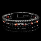 Wear this stylish Crucible Men's Jewelry leather and stone bracelet with any style. The bracelet has one black braided leather row, and the second row is a strand of natural stone beads. The alternating stone pattern consists of Red Tiger Eye Stones and Onyx stone beads. The bracelet comes together with a black plated stainless steel magnetic slide clasp.