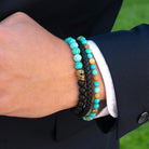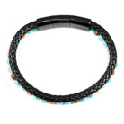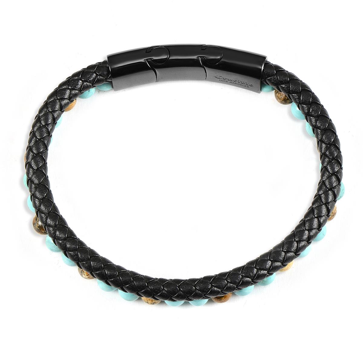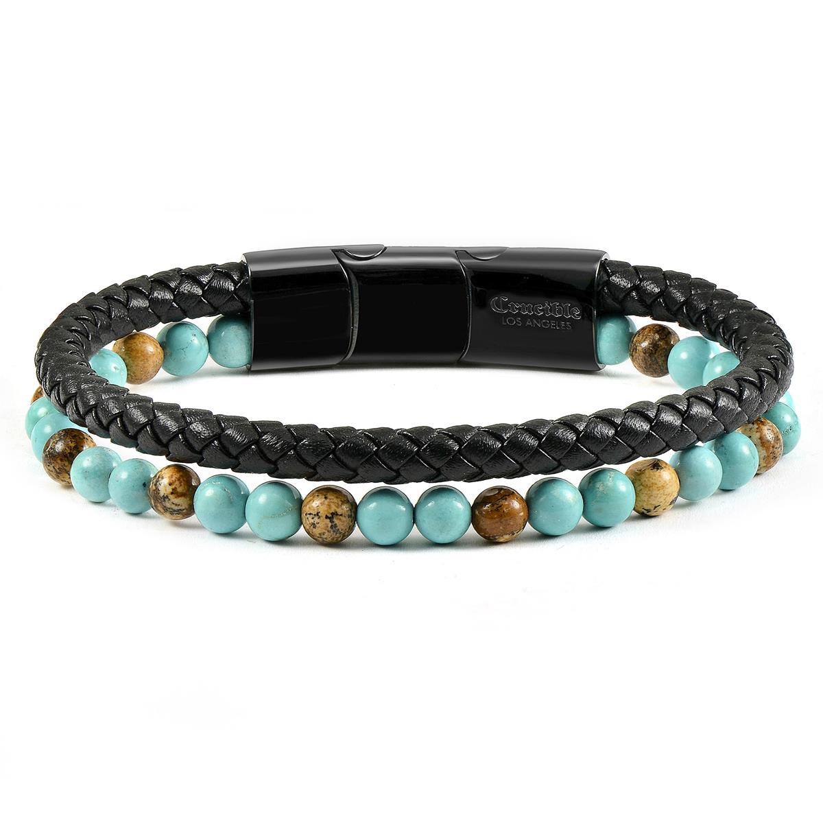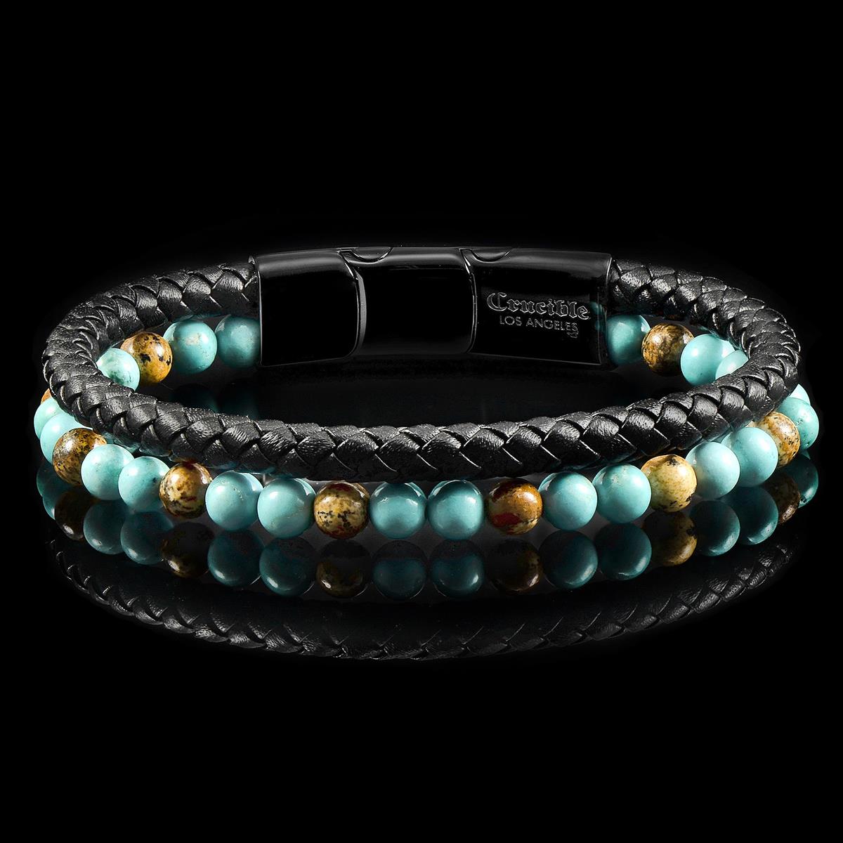 Wear this stylish Crucible Men's Jewelry leather and stone bracelet with any style. The bracelet has one black braided leather row, and the second row is a strand of natural stone beads. The alternating stone pattern consists of Turquoise and Picture Jasper stone beads. The bracelet comes together with a black plated stainless steel magnetic slide clasp.