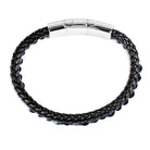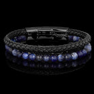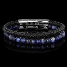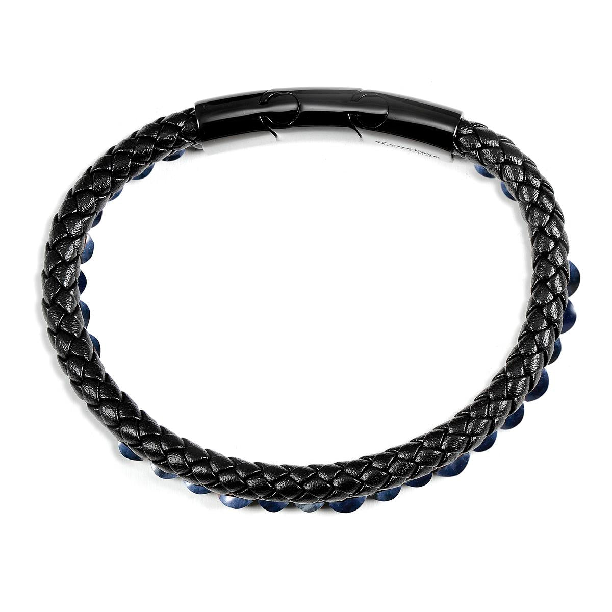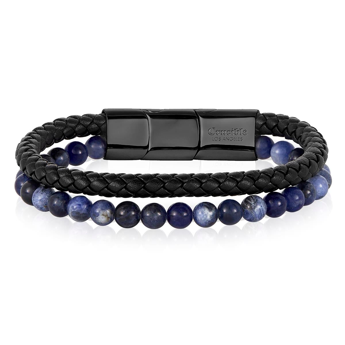 Wear this stylish Crucible Men's Jewelry Black Leather and Sodalite Stone Bead bracelet with any style. The bracelet has one black braided leather row, and the second row is a strand of natural stone beads. The bracelet comes together with a stainless steel magnetic slide clasp. The clasp is available in your choice of black plated stainless steel or polished stainless steel.