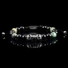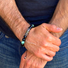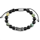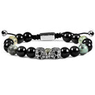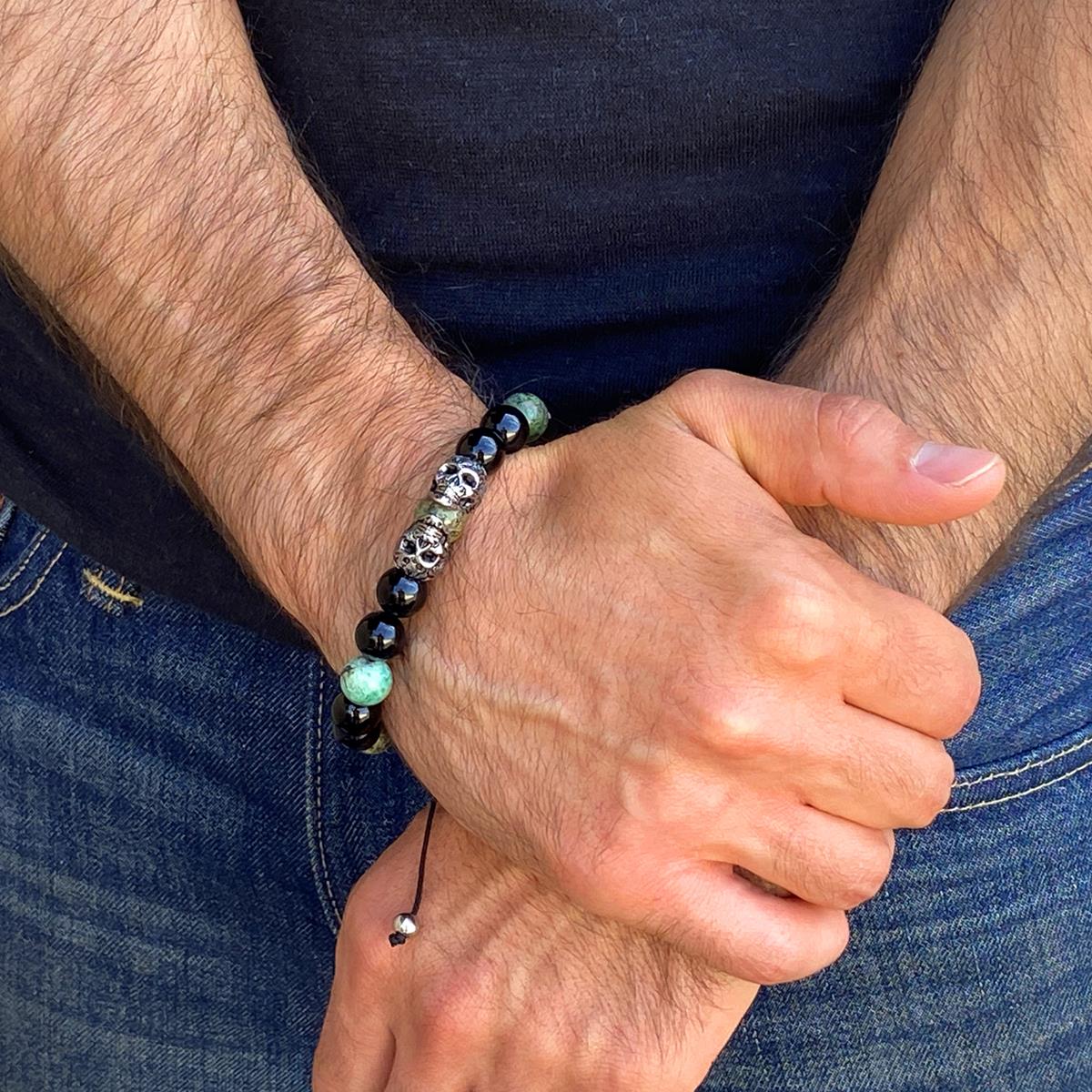 Add this bold skull and stone piece to your choice of daily accessories. The adjustable bracelet has 5 African Turquoise stones paired with 12 Onyx stones and 2 Steel Skull beads.