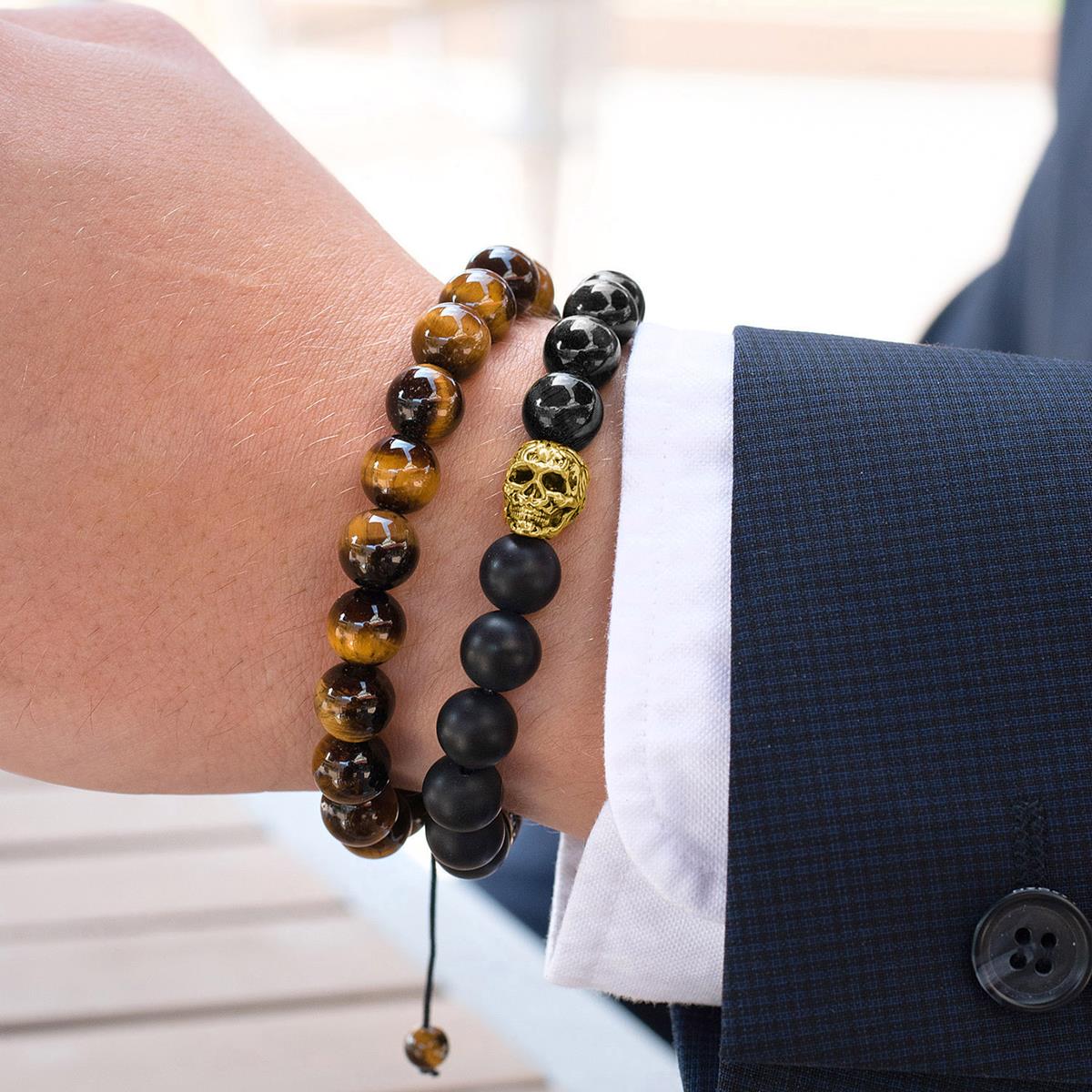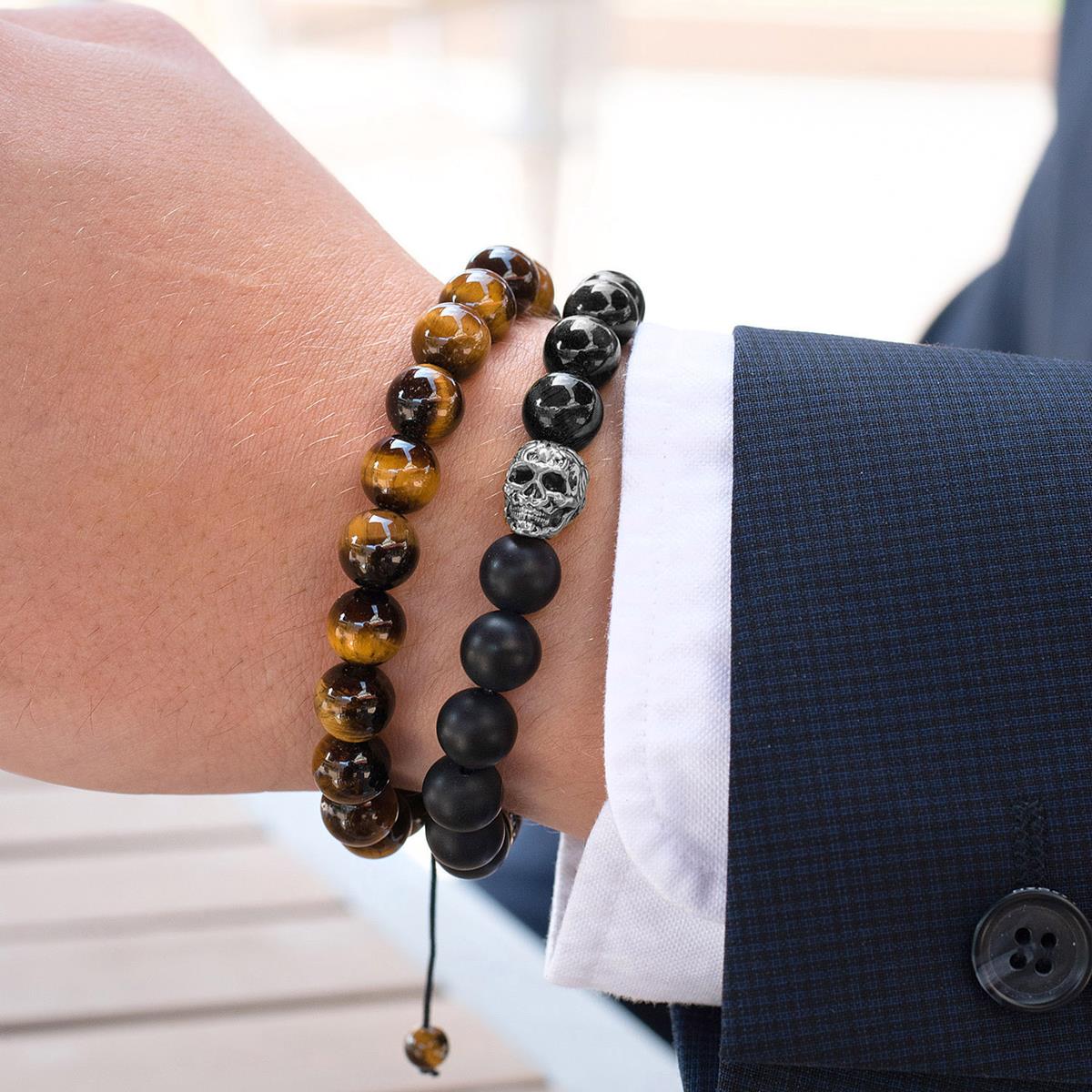 Wear this bold stone stretch bracelet and easily pair it with every look. The bracelet has 9 matte Onyx stones contrasted by 9 polished Onyx stones. The center of the bracelet has 1 skull bead and 1 steel bead spacer bead on the opposite end.