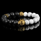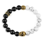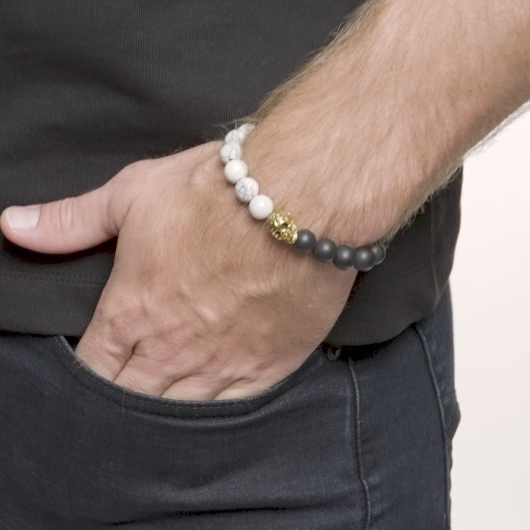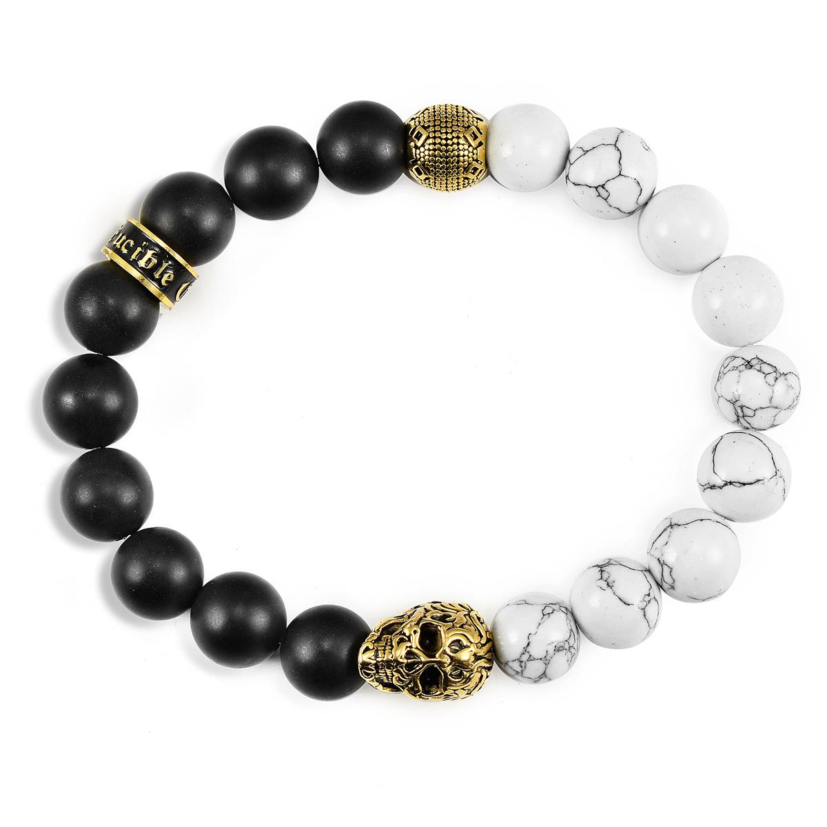 Crucible Gold Skull Stretch Bracelet with 10mm Matte Black Onyx and Howlite Beads