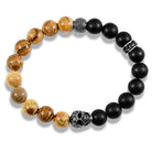 Wear this bold stone stretch bracelet and easily pair it with every look. The bracelet has 9 matte Onyx stones contrasted by 9 polished Picture Jasper stones. The center of the bracelet has 1 skull bead and 1 steel bead spacer bead on the opposite end.