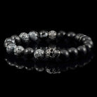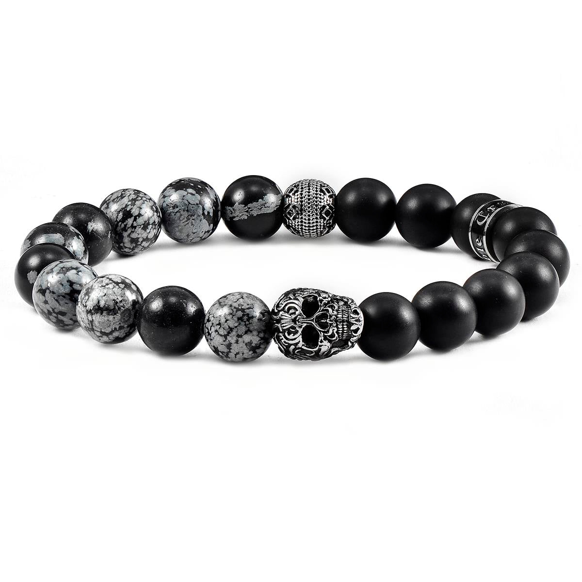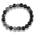 Crucible Skull Stretch Bracelet with 10mm Matte Black Onyx and Snowflake Agate Beads