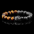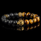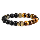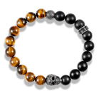 Crucible Gold Skull Stretch Bracelet with 10mm Matte Black Onyx and Tiger Eye Beads