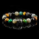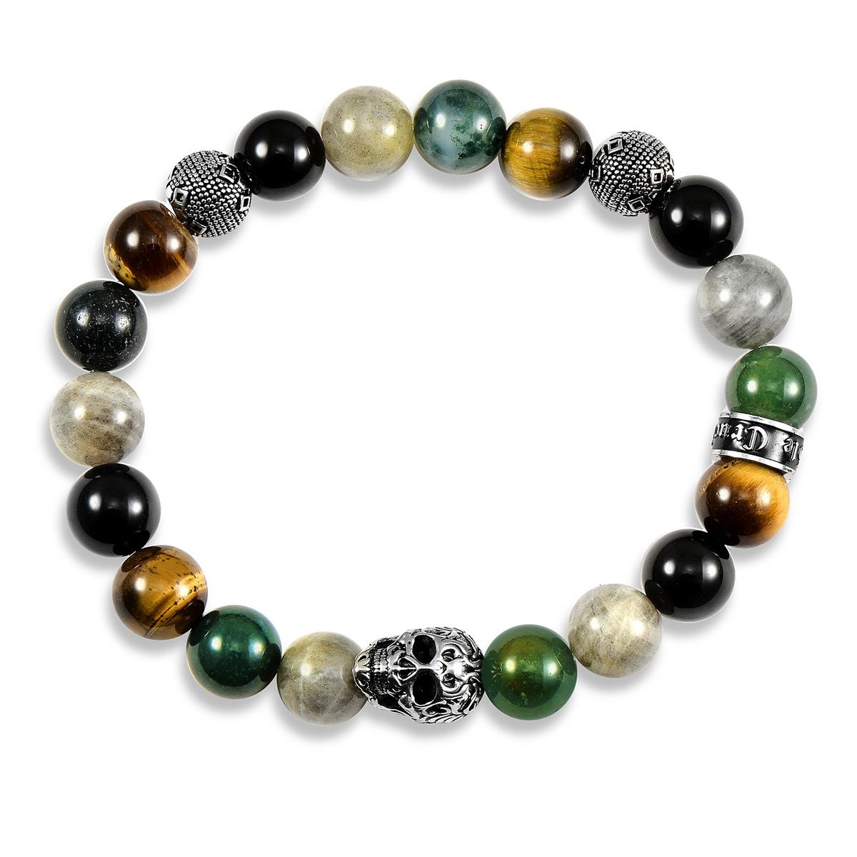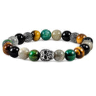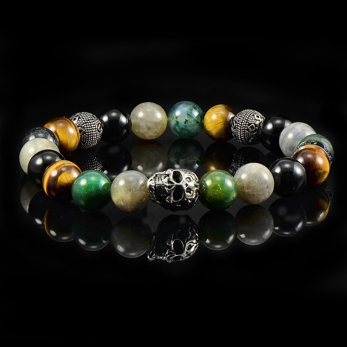 Crucible Skull Stretch Bracelet with 10mm Polished Black Onyx, Labradorite, Green Tiger Eye, Moss Agate and Tiger Eye Beads