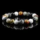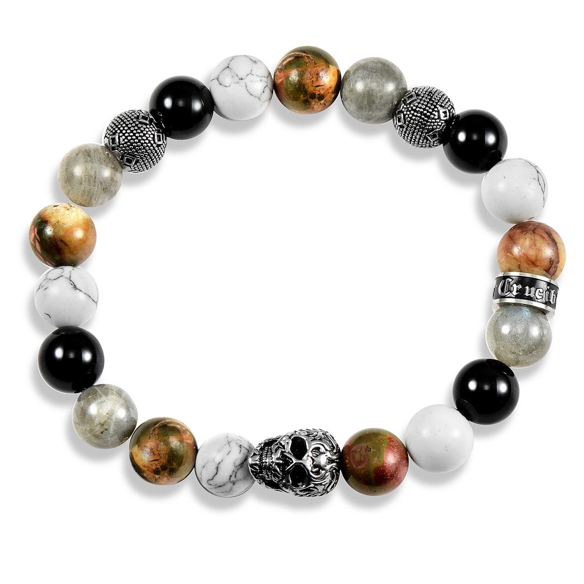 Crucible Skull Stretch Bracelet with 10mm Polished Black Onyx, Labradorite, Howlite and Picasso Jasper Beads