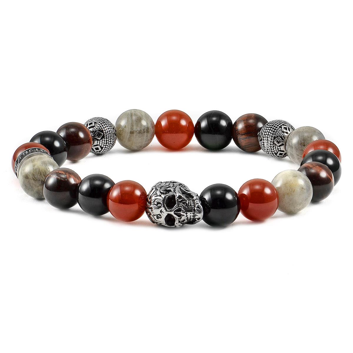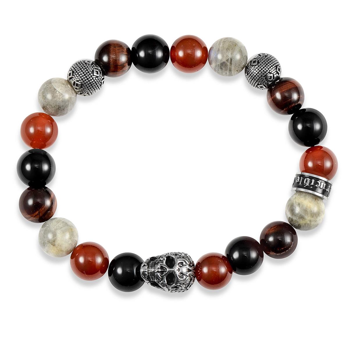 Crucible Skull Stretch Bracelet with 10mm Polished Black Onyx, Labradorite Red Tiger Eye and Red Agate Beads