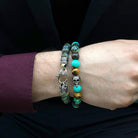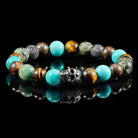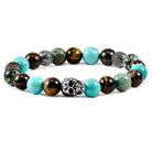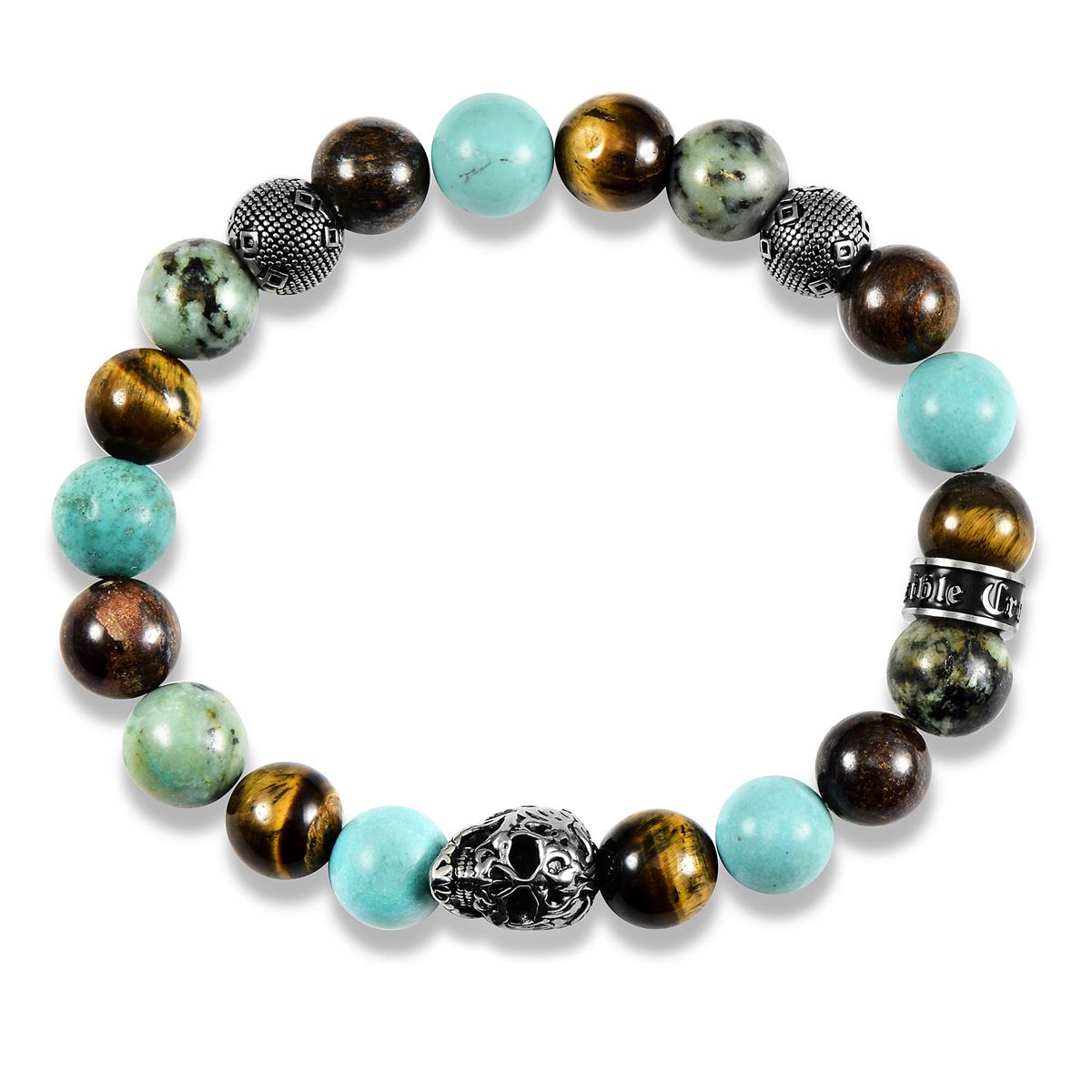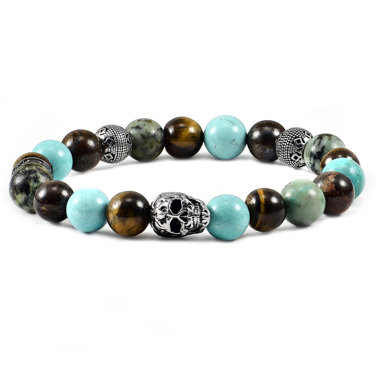 Crucible Skull Stretch Bracelet with 10mm Tiger Eye, Genuine Turquoise, African Turquoise and Bronzite Beads