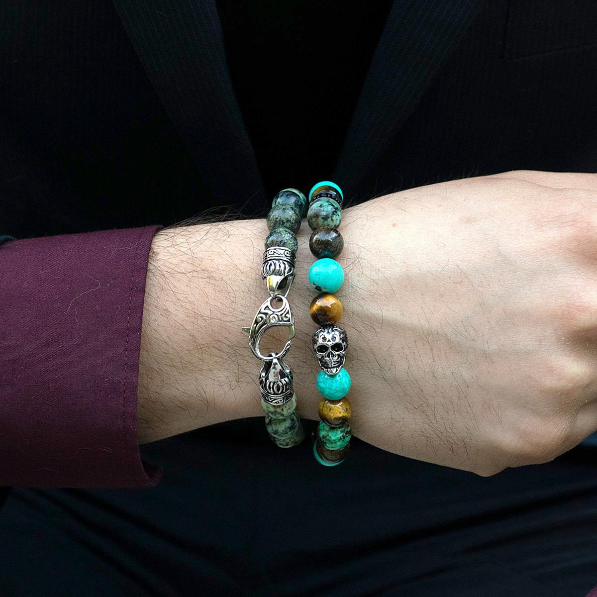 Single Skull Stretch Bracelet with 10mm Tiger Eye, Genuine Turquoise, African Turquoise and Bronzite Beads