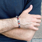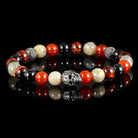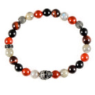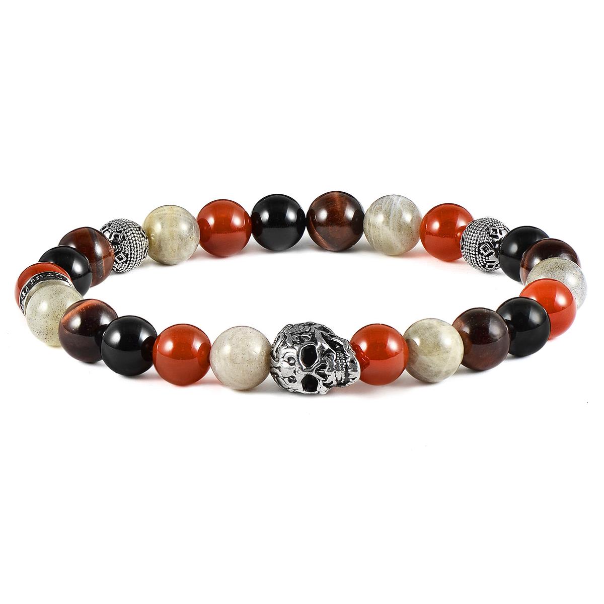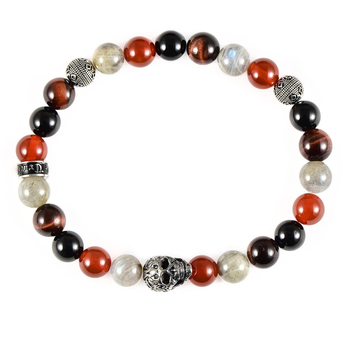 Crucible Skull Stretch Bracelet with 8mm Polished Black Onyx, Labradorite Red Tiger Eye and Red Agate Beads