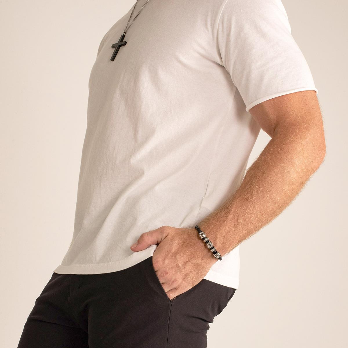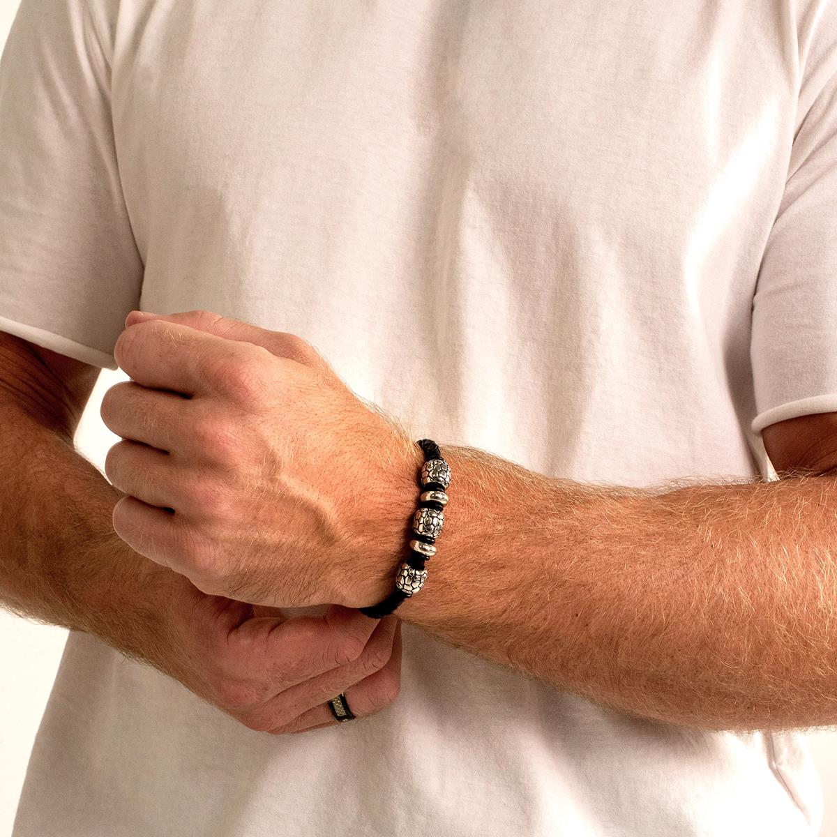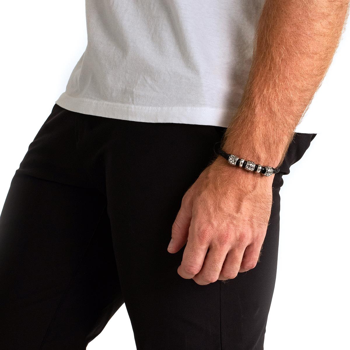 Add this stylish leather bracelet to your choice of daily wear. The leather bracelet has three large textured steel beads alternating with black rubber stoppers and two steel discs.