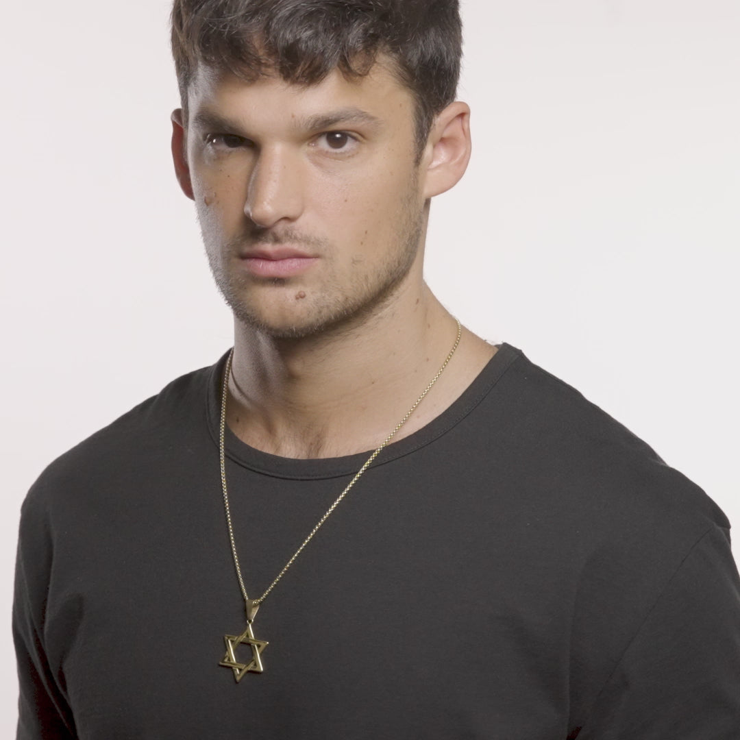 Measuring from the top of the bail to the bottom of the pendant, the length is 49mm or 1-15/16 inches. The length of the Star of David itself is 39mm or 1-9/16 inches. The width of the pendant is 30mm or 1-3/16 inches. The pendant is paired with a 24 inch box chain and secures with a lobster claw clasp.
